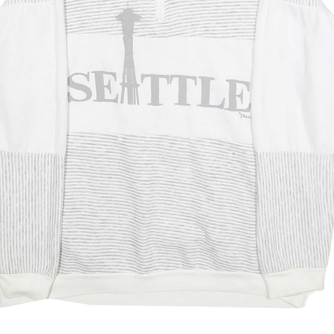 This B&J mens sweatshirt features a white base with grey horizontal stripes across the upper chest, sleeves, and lower body sections. A bold "SEATTLE" graphic print in grey spans across the front along with a silhouette of the iconic Space Needle. The sweatshirt has a half zip collar in solid white that adds style and ease of wear.
