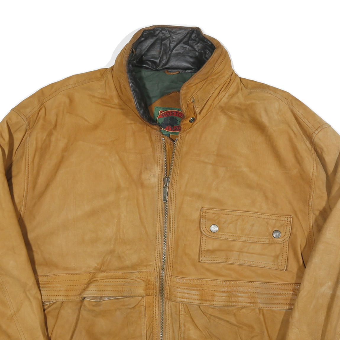 This Boston Traders mens jacket features a tan leather exterior with a soft, worn-in texture showing subtle natural distress marks and creases. It has a zip closure at the front and a high collar with snap button fastening. There are three pockets on the front, including a button-flap chest pocket and two side hand pockets, all blending with the tan leather material.