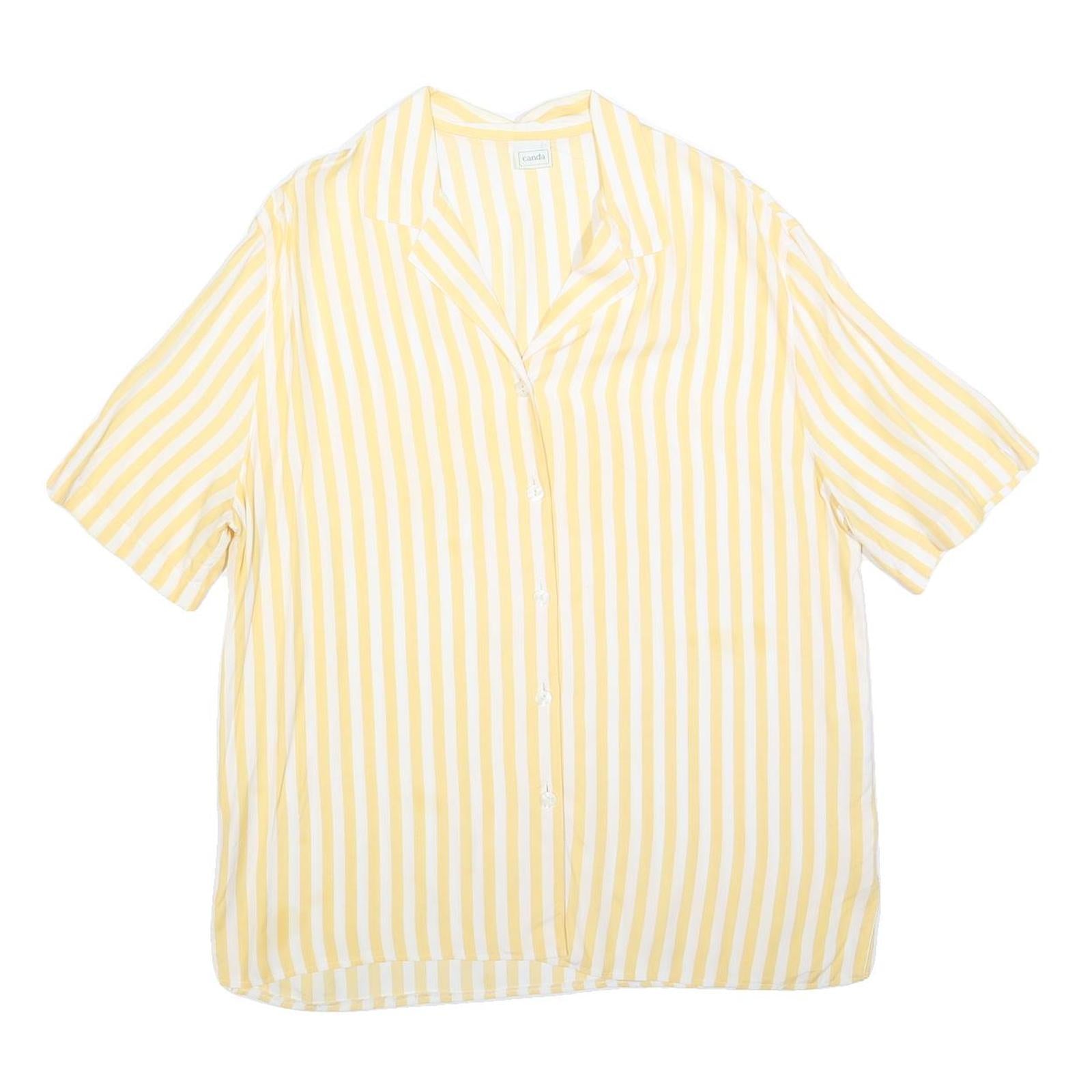 This womens top from CANDA features a cheerful yellow and white vertical striped pattern, creating a fresh and summery look. The shirt has a classic collar and a full button-down front that enhances its casual style. The fabric is a soft cotton blend that provides comfort and breathability, suitable for warm weather.