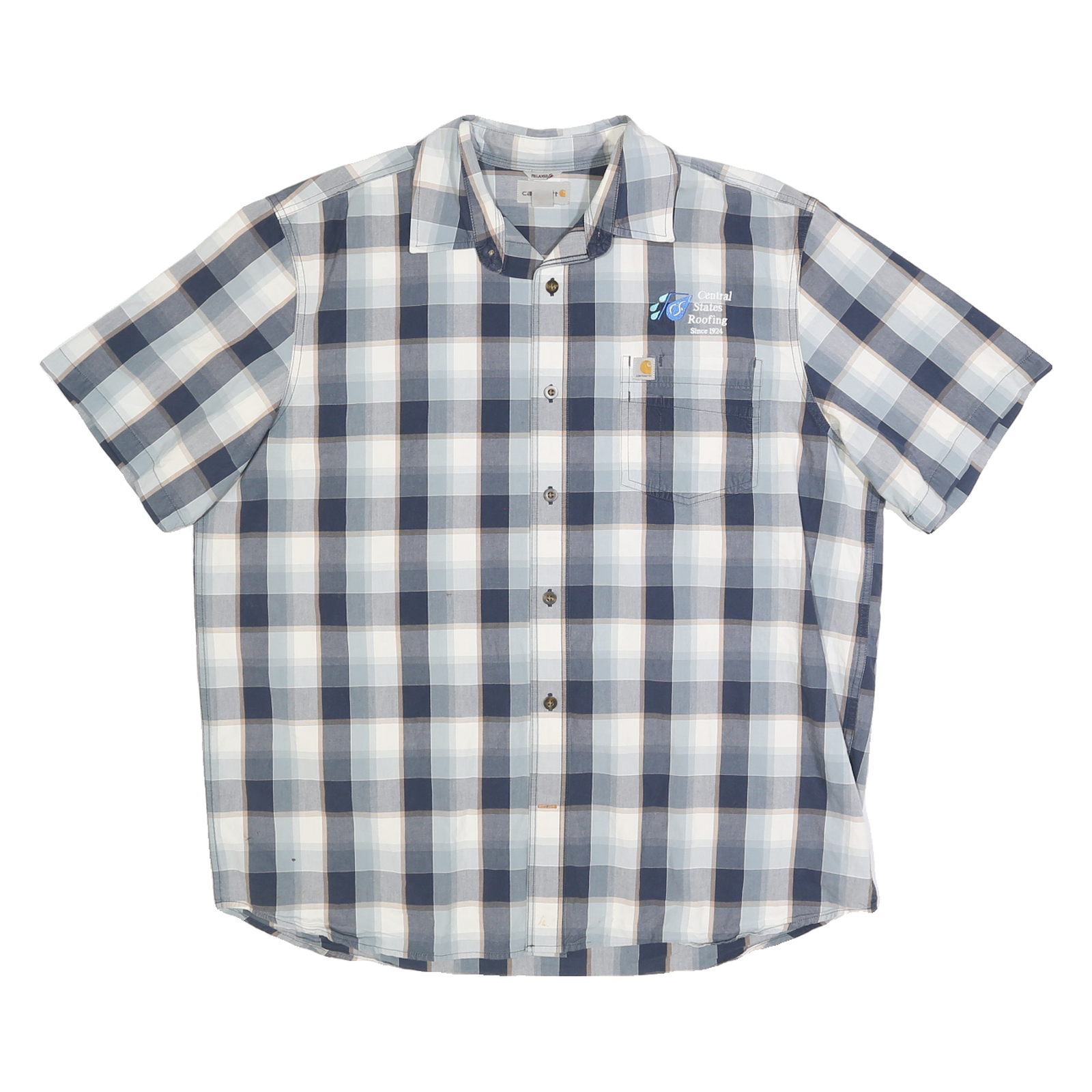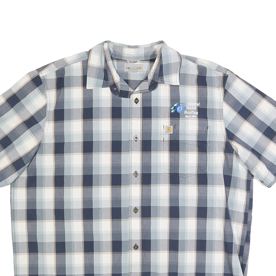 This Carhartt Mens shirt showcases a classic blue and white check pattern with subtle brown accents, featuring an embroidered front chest pocket with "Central States Roofing Since 1924" alongside the Carhartt label for authentic branding.