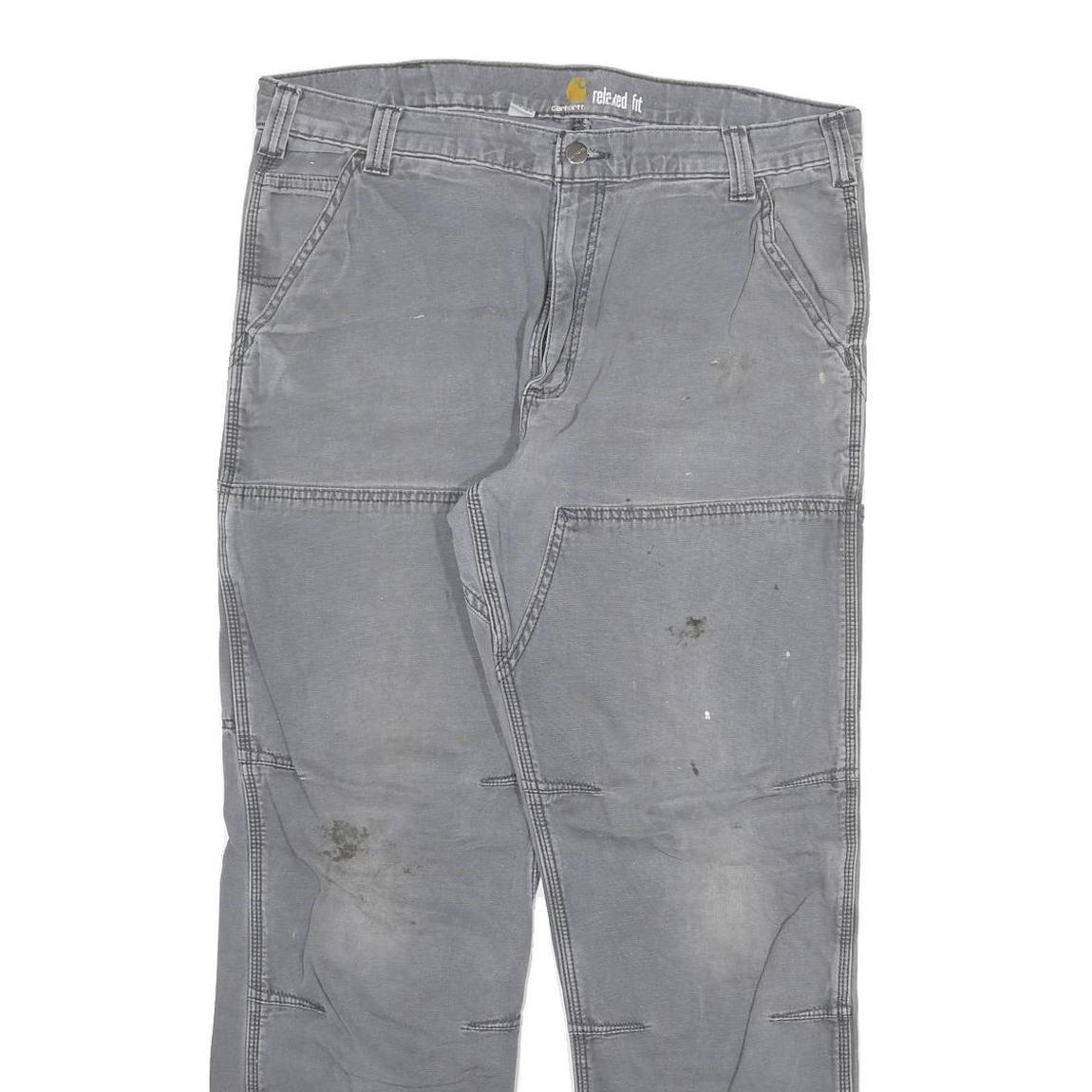 These CARHARTT mens trousers feature a sturdy cotton blend fabric in a solid grey colour. The design is rugged with reinforced stitching at the knees and multiple pockets, including side and back patch pockets with the branded patch visible on the back right pocket. The front closes with a zip and button.