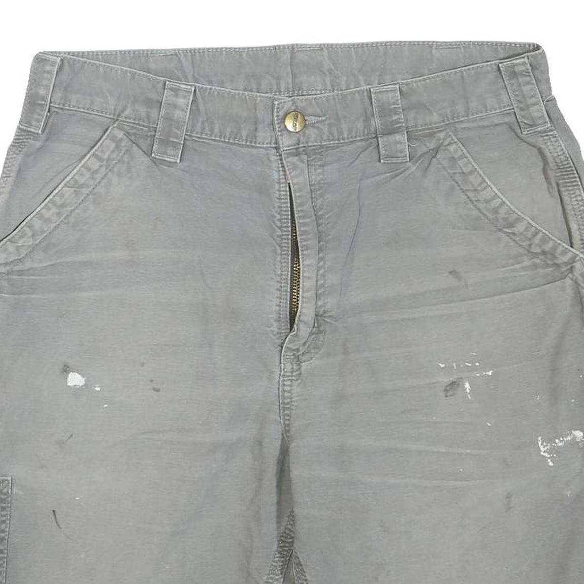 These Carhartt Mens shorts feature a light grey colour with a well-worn, utilitarian style. They have visible paint stains and marks consistent with workwear use. The fabric is a durable cotton blend providing comfort and robustness ideal for physical activities or casual wear.