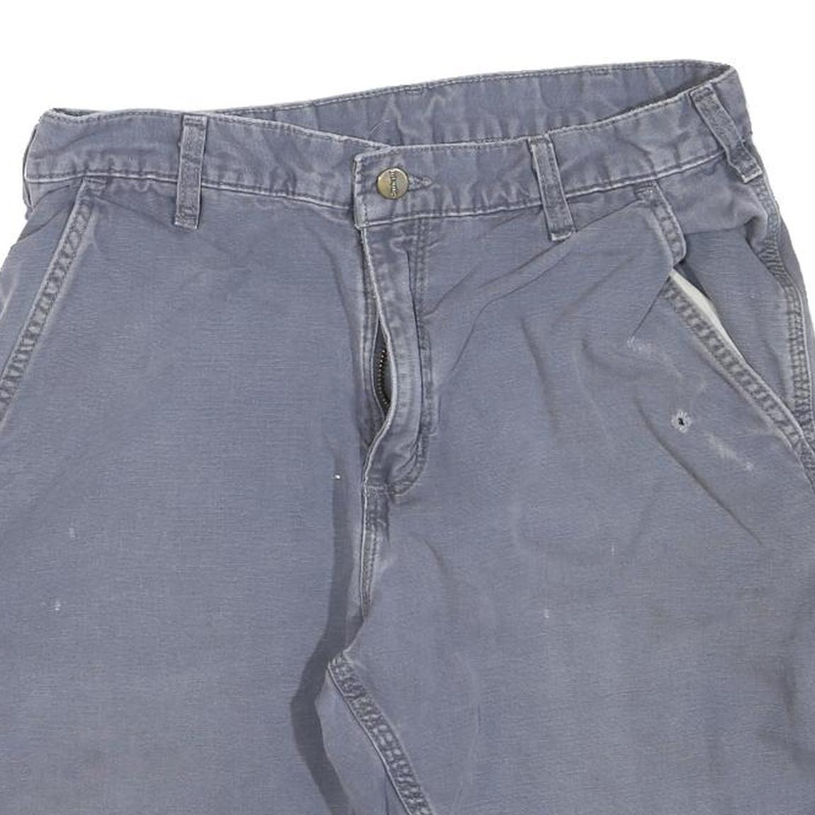 These Carhartt mens shorts are crafted in a sturdy cotton blend fabric with a worn blue hue that gives them a vintage, relaxed look. Featuring a classic casual style, they have a button and zip closure at the front and reinforced seams for added durability. The garment shows light signs of wear including some small marks and a tiny hole near the right front pocket, reflecting their previous use but still functional and stylish.
