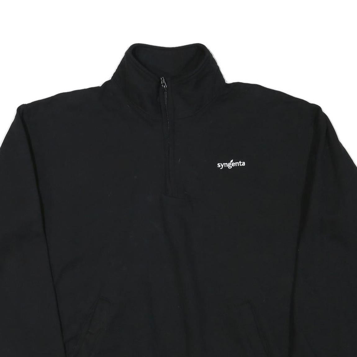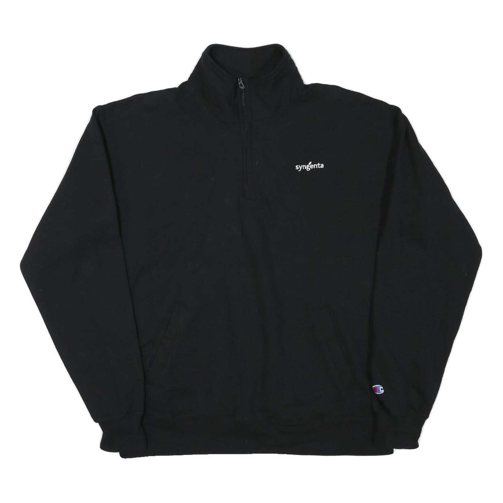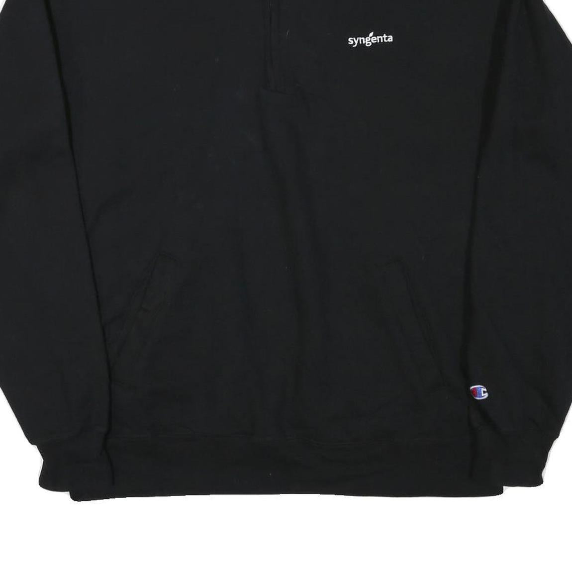 This Champion mens sweatshirt comes in a classic black colour with a clean and simple design. It features a quarter zip collar and prominent branding on the front with the small white "syngenta" logo and the Champion “C” logo patch on the sleeve cuff. The sweatshirt also has two front hand pockets for convenience.