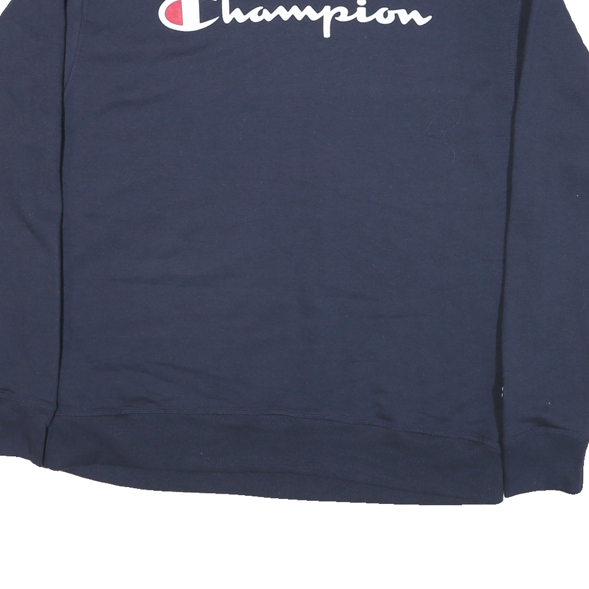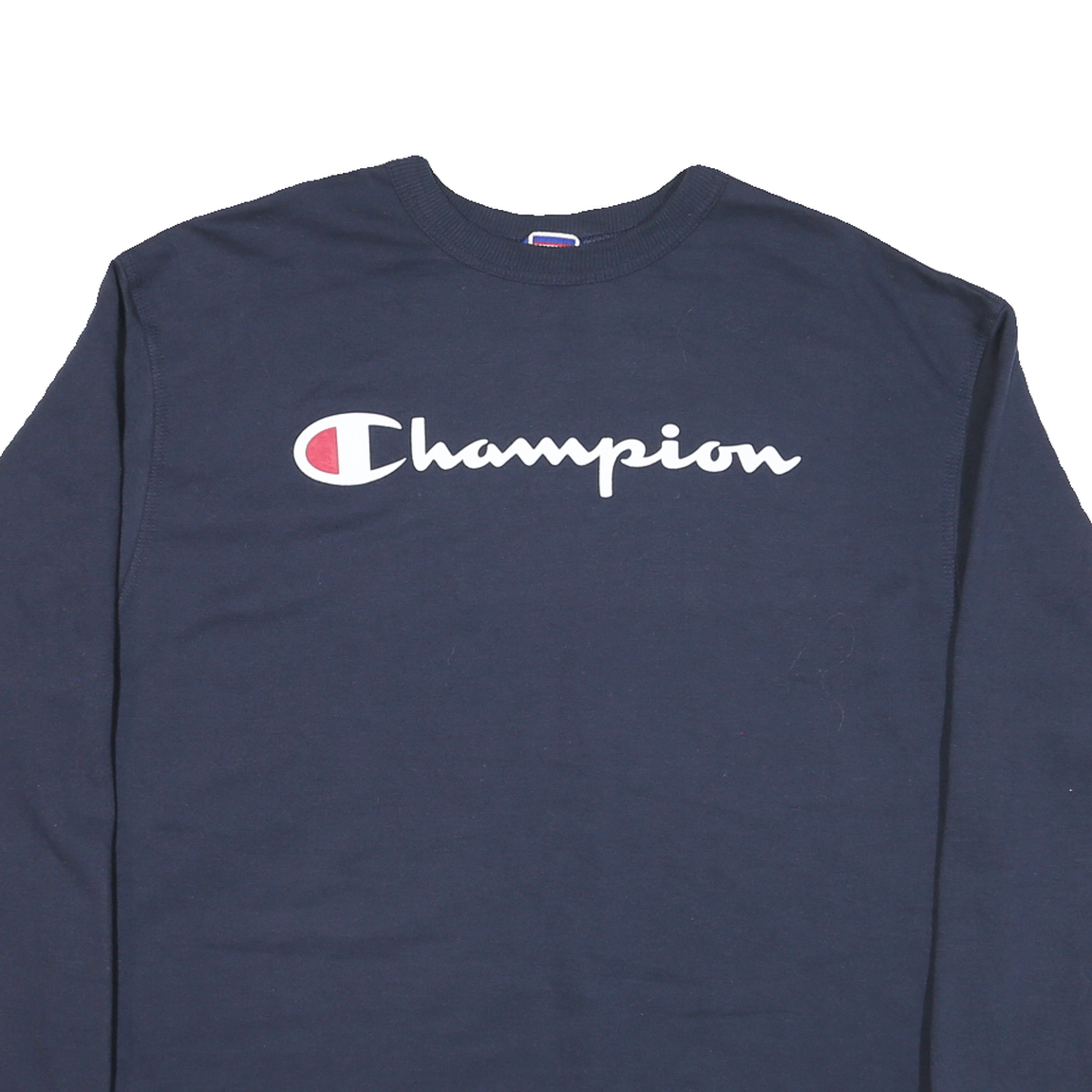 This men's sweatshirt by Champion features a deep blue colouration with a prominent Champion logo printed across the chest in white and red accents. The classic crew neck design and ribbed cuffs and hem add to its timeless sporty appeal. There is a smaller embroidered Champion logo detail near the left hem on the back.