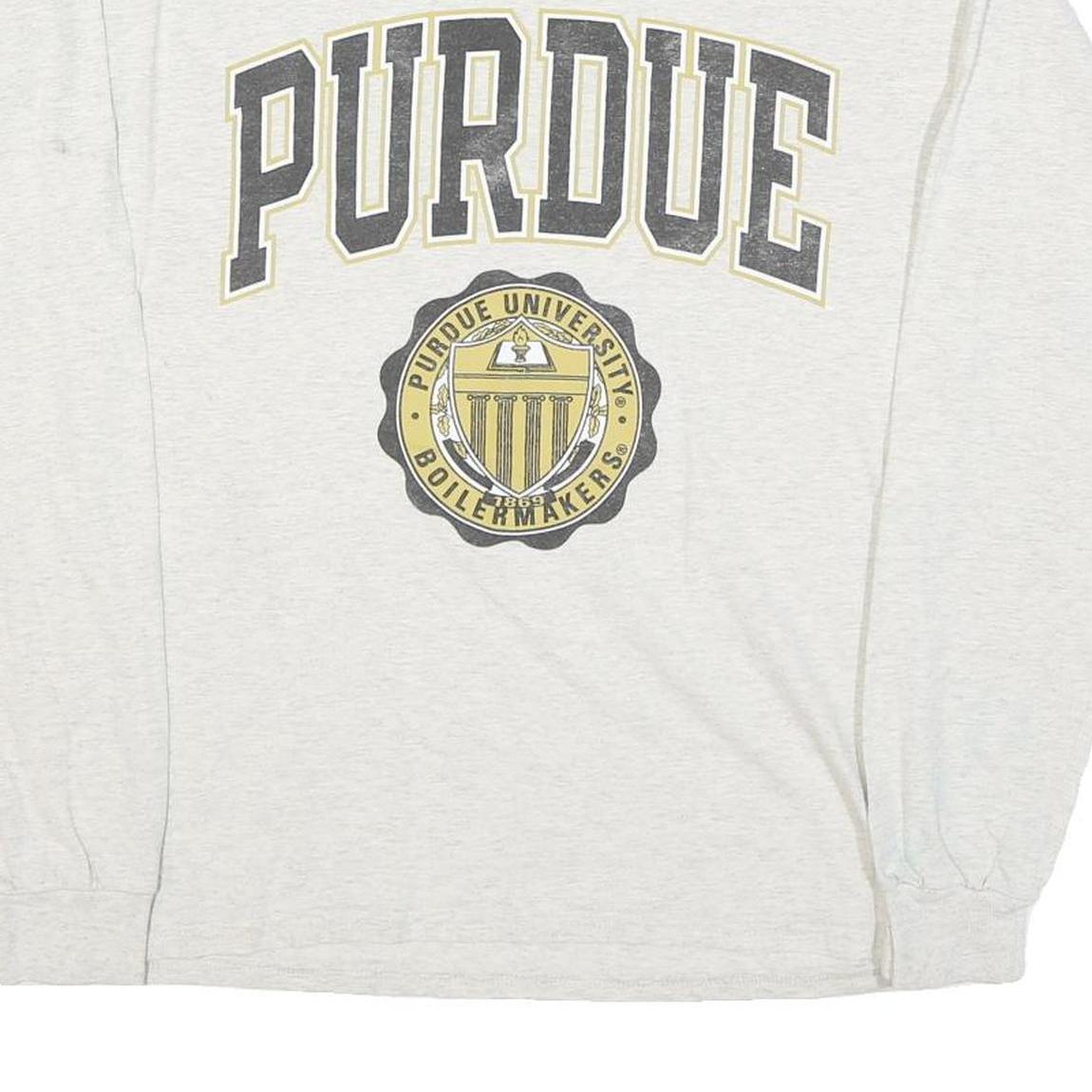 This long sleeve T-shirt showcases a soft white base with a bold "PURDUE" text across the chest in large black and gold lettering. Below the text is a circular emblem featuring the Purdue University Boilermakers seal in matching colours, enhancing the collegiate graphic appeal. The Champion logo appears discreetly on the left cuff in red, white, and blue embroidery.