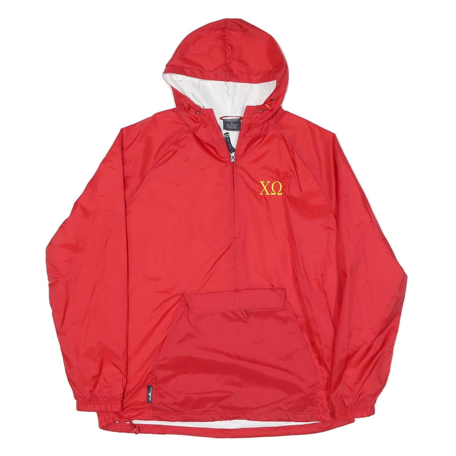 This Charles River mens jacket features a bright red nylon fabric with a smooth texture and a plain pattern. It has a prominent yellow embroidered design on the left chest featuring Greek letters Xi and Omega. The jacket includes a zip closure at the front and an attached hood lined with white fabric for contrast.