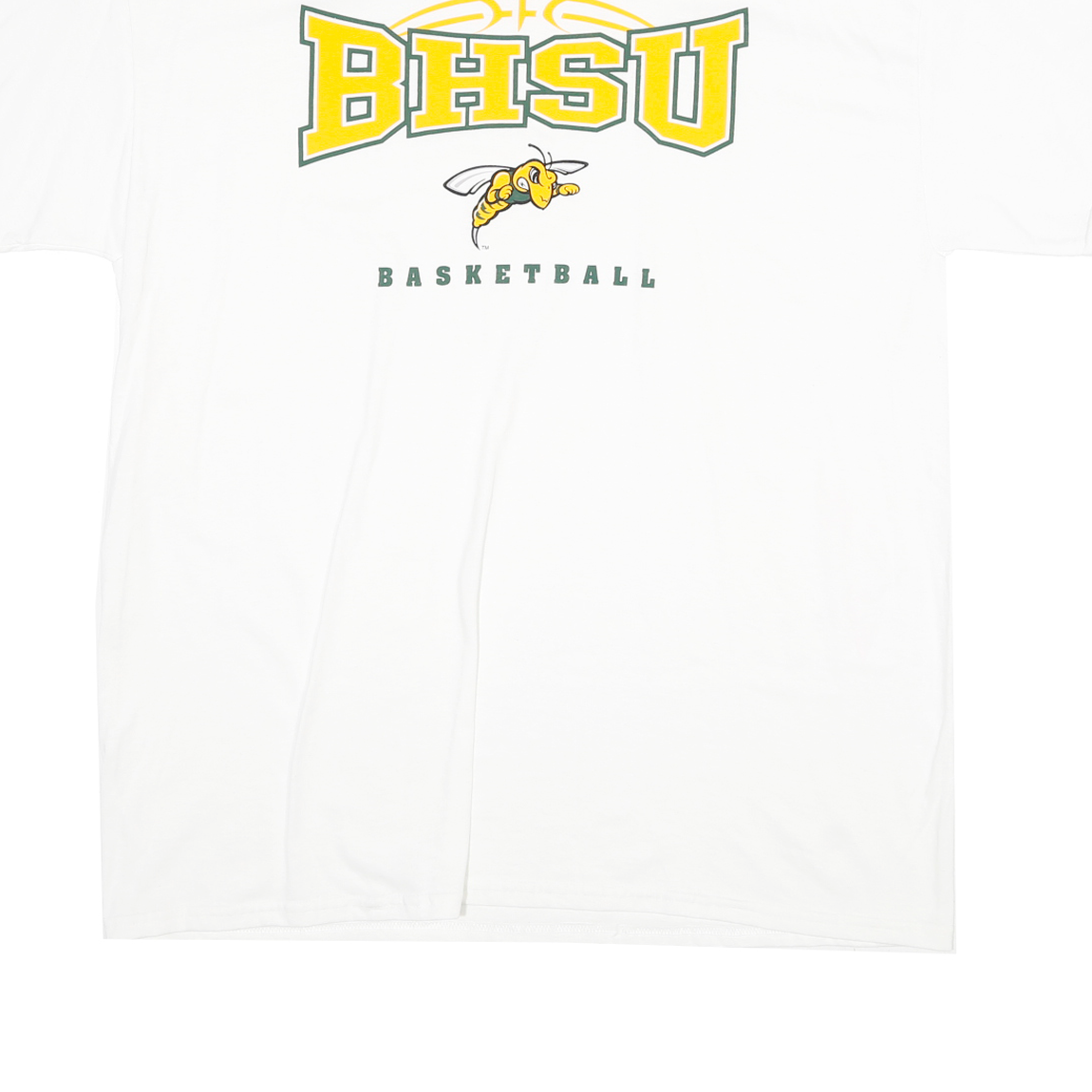 This mens white T-shirt by CI SPORT features a bold graphic print on the front displaying the letters 'BHSU' in large yellow and green outlined text with a yellow hornet mascot beneath and the word 'BASKETBALL' below in green. The back showcases a smaller faded text with the statement 'DO IT BETTER.' and a website link, adding unique detail to the casual style.