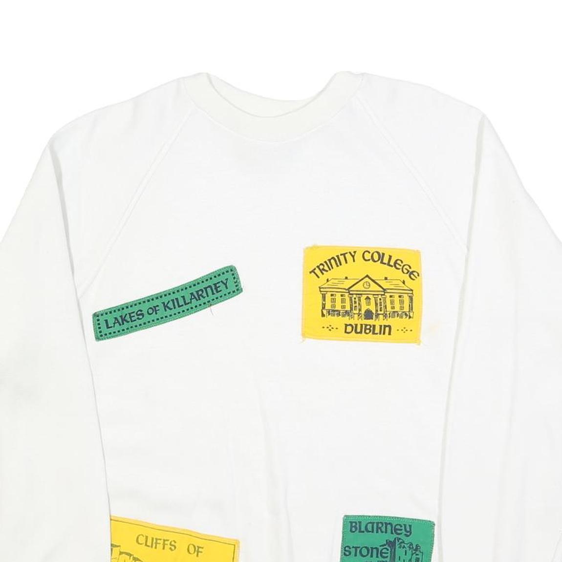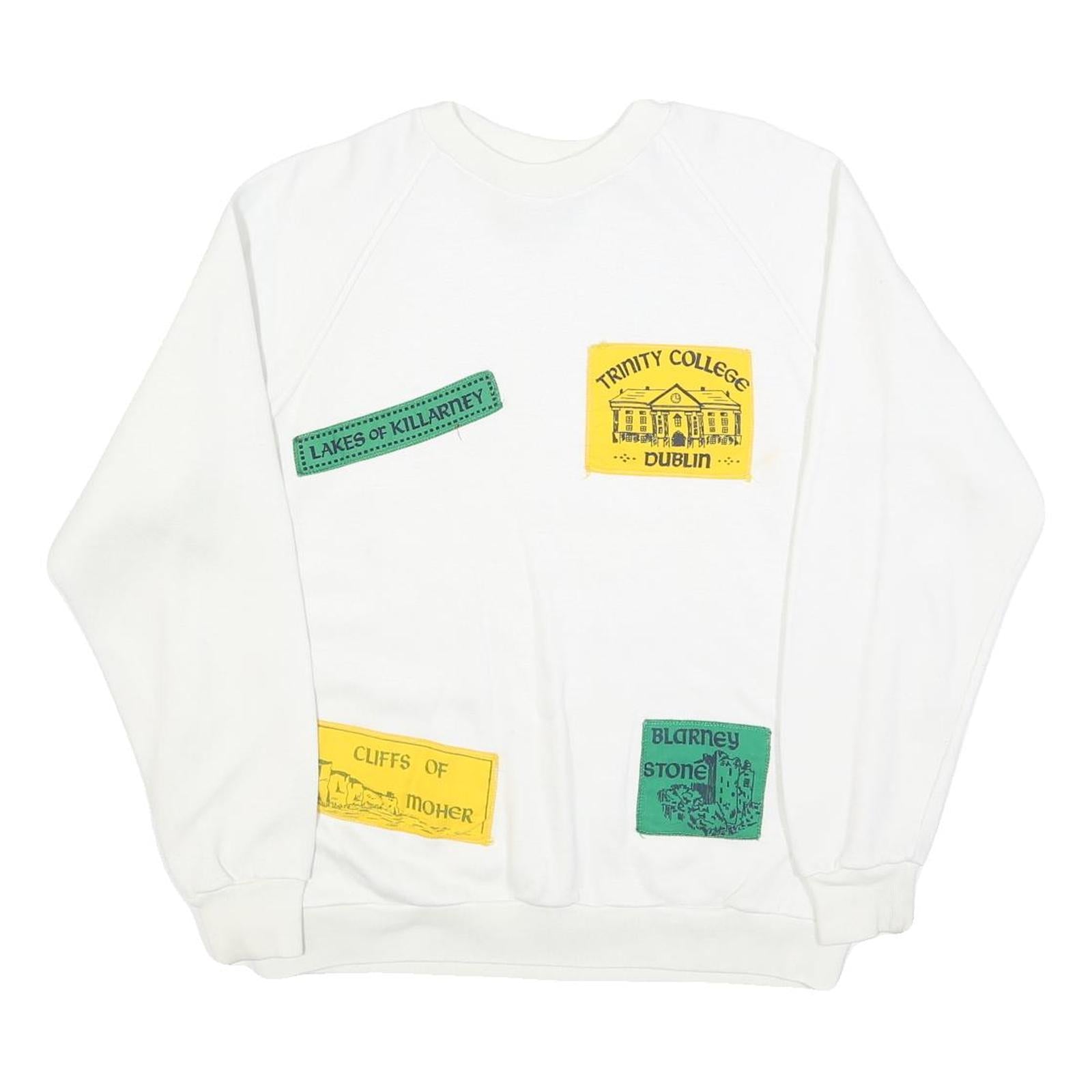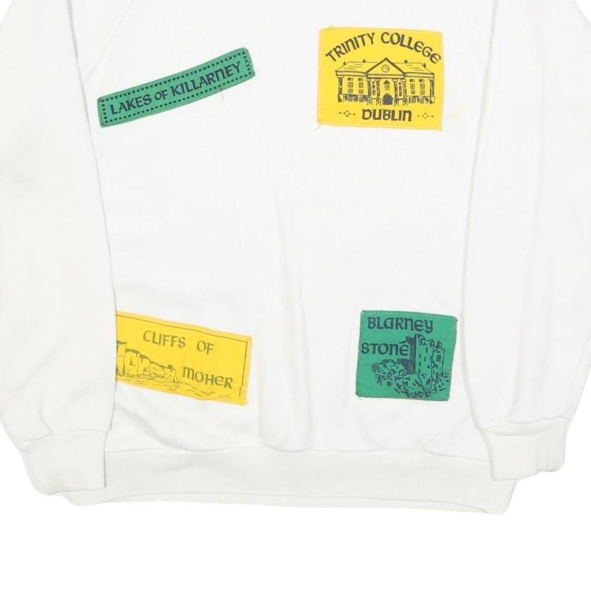 This womens sweatshirt by CONNOLLY is crafted from a soft cotton blend fabric, providing both comfortable wear and durability. It features a classic white base adorned with colourful stitched patches showcasing iconic Irish landmarks such as "Trinity College Dublin," "Cliffs of Moher," "Blarney Stone," and "Lakes of Killarney." The sweatshirt's crew neck and long sleeves make it a versatile layering piece for casual wear.