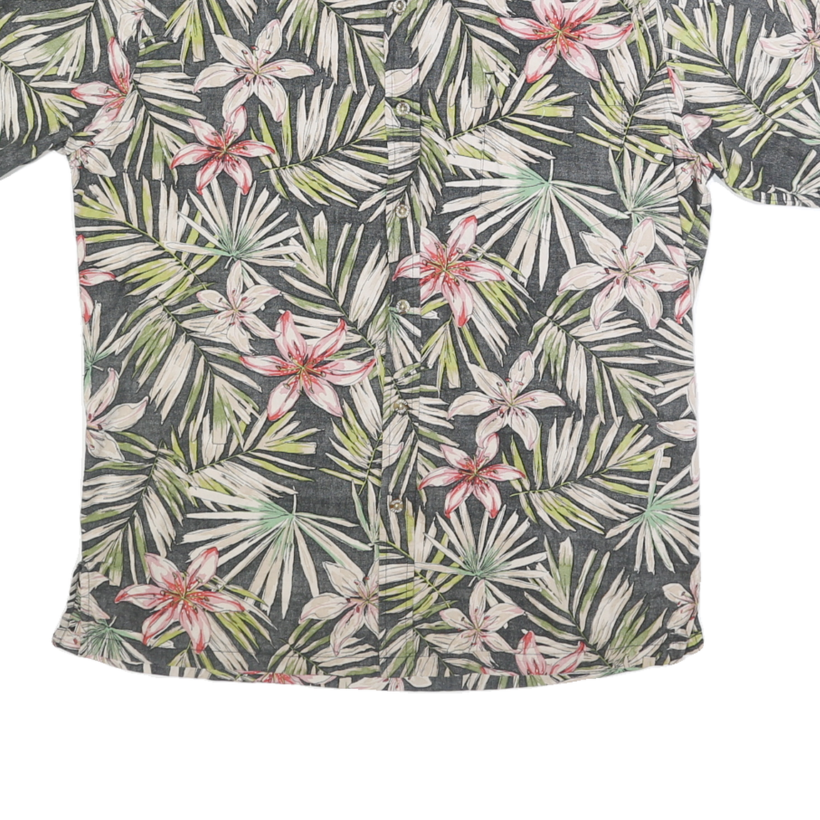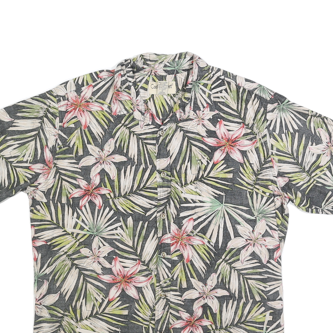 This mens Cooke Street shirt features a vibrant floral pattern with pink lilies and green palm leaves on a black and cream background, perfect for summer wear. Made from soft 100% cotton, it offers a comfortable, breathable feel. The shirt has a classic button closure and a relaxed fit with short sleeves, ideal for casual occasions or holidays. Cooke Street is known for its laid-back, tropical-inspired designs that capture a carefree lifestyle and timeless style.