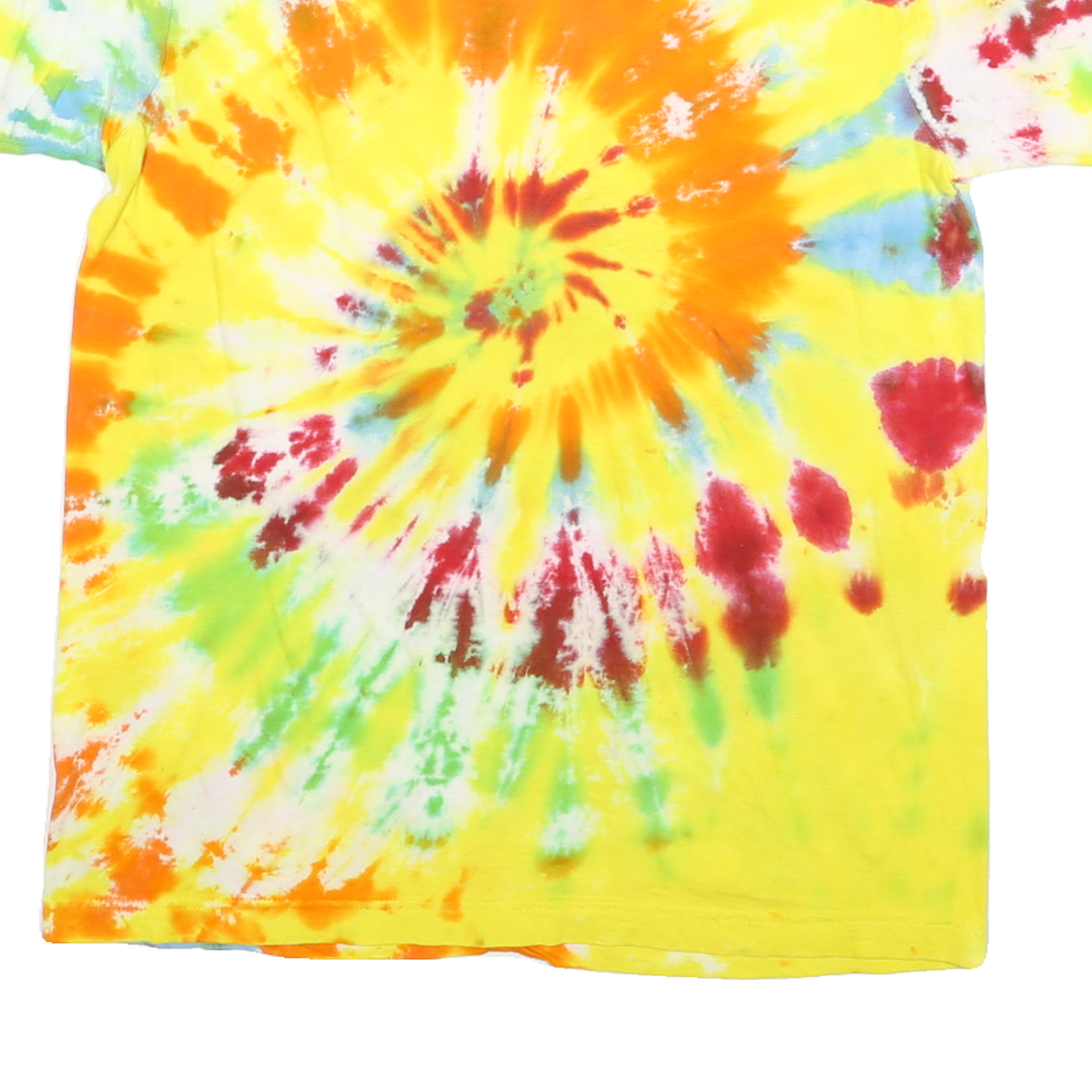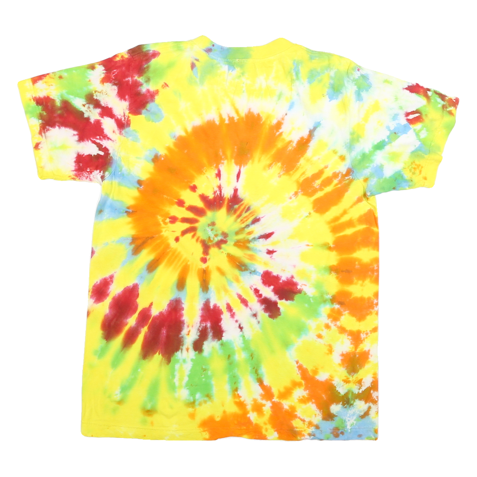 This Dancing Robin Mens T-shirt features a vibrant tie dye pattern with a bright yellow base accented by swirls of orange, green, red, and blue. The eye-catching spiral design dominates the front and back, creating a colourful and playful look. The t-shirt has a classic crew neck and short sleeves.
