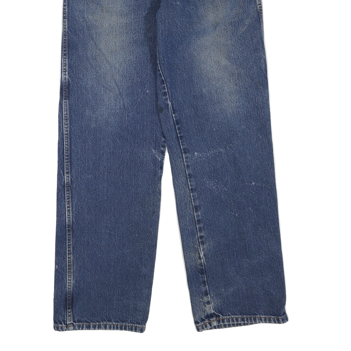 These Dickies mens jeans come in a classic blue shade with a medium wash and slight natural fading. The denim fabric features visible wear marks and some paint splatters to give a vintage, broken-in look. On the back right pocket, the iconic Dickies brand patch adds a touch of authenticity.