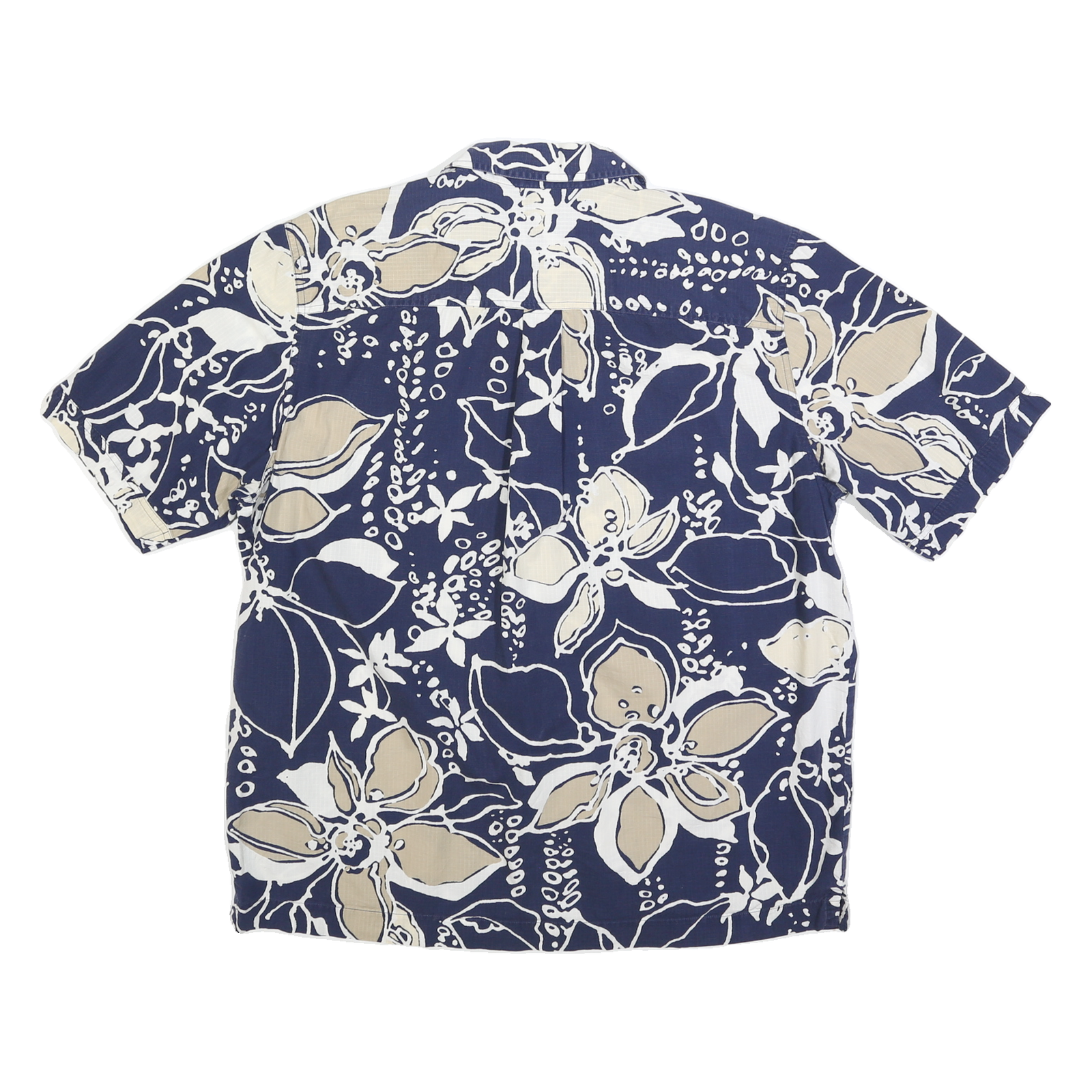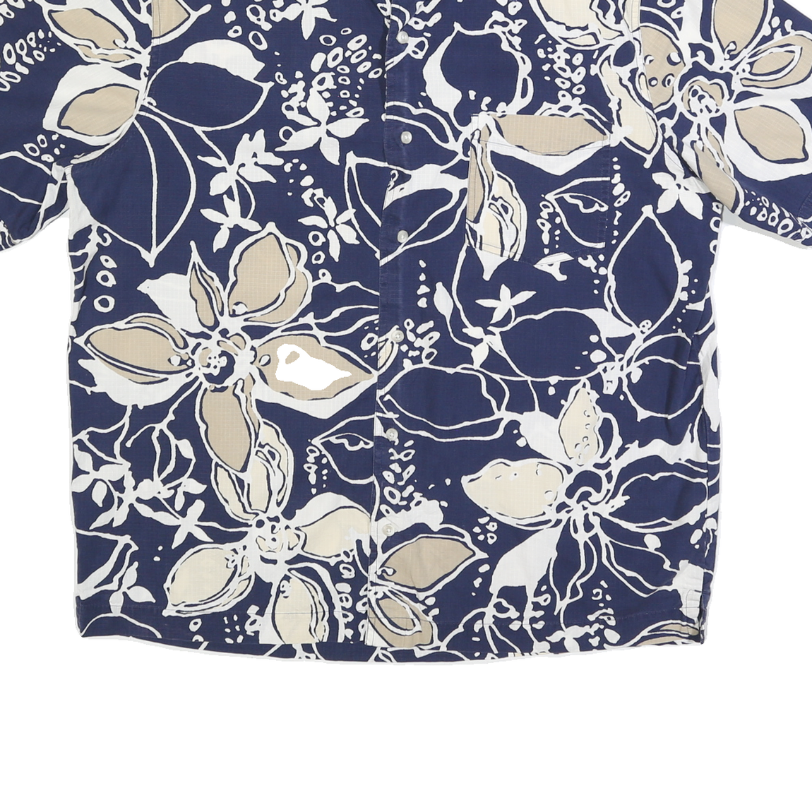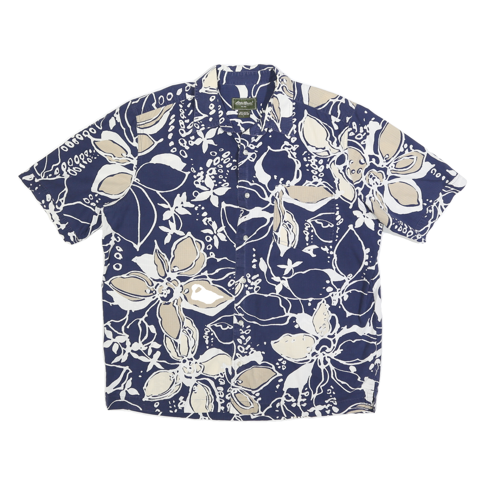 This Eddie Bauer mens shirt features a bold blue base with an all-over beige and white floral print, creating a striking tropical style. The short sleeves and front chest pocket add to its classic casual look.