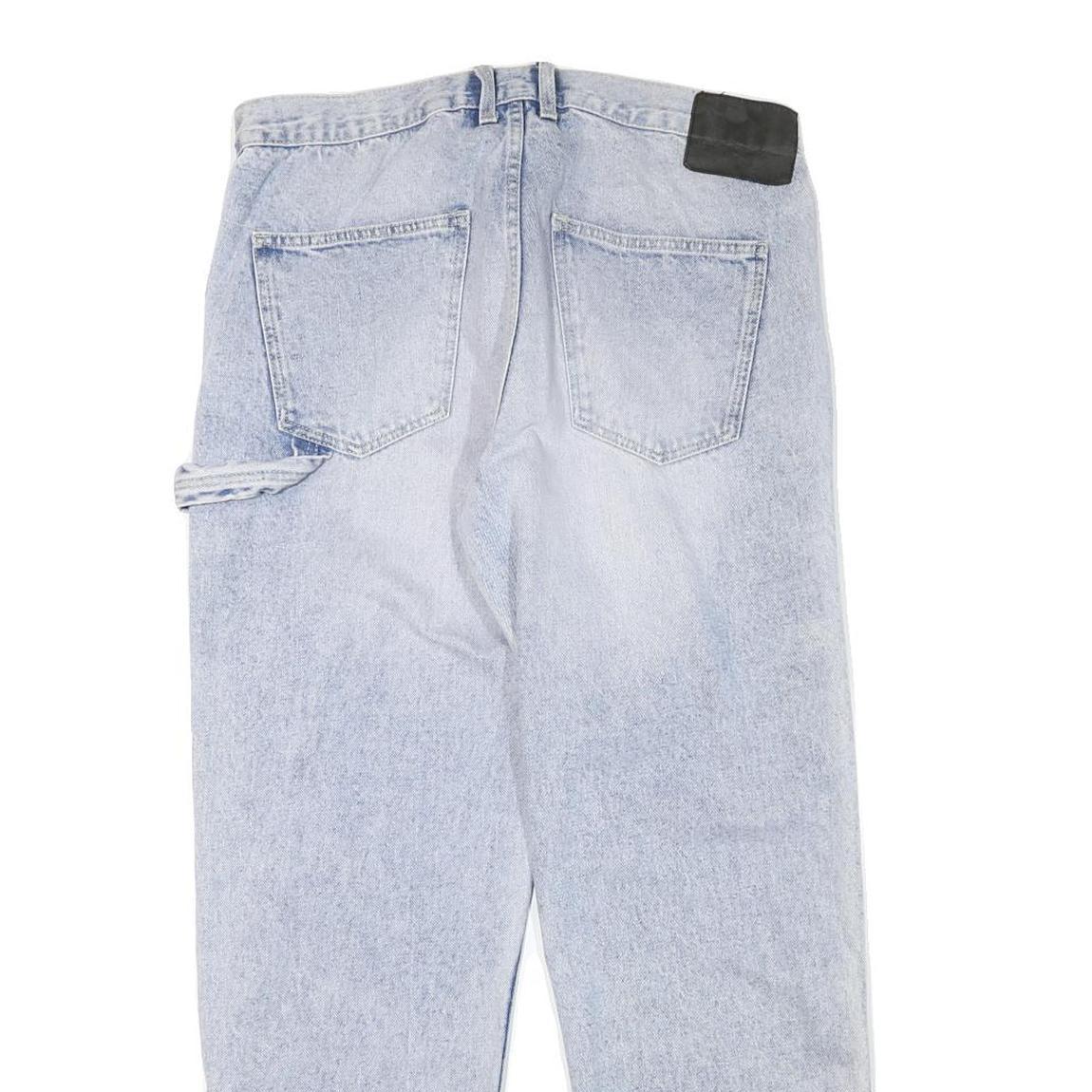 These FSBN jeans feature a light blue denim colour with a slightly faded and worn appearance due to visible signs of previous wear. The front showcases distinctive patch detailing on the legs and traditional slanted side pockets, complemented by back patch pockets and a utility loop on the side.