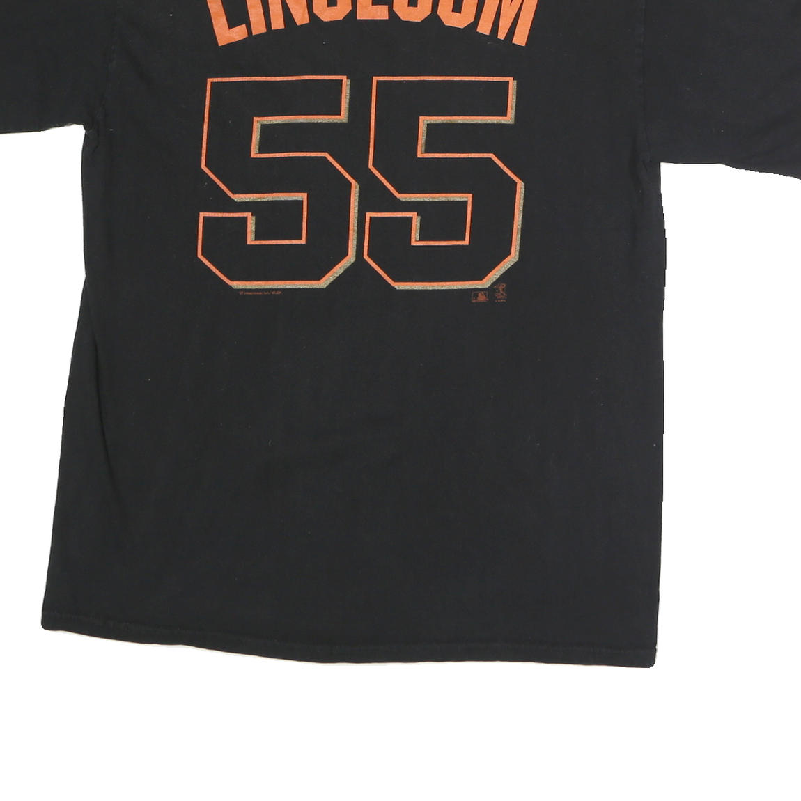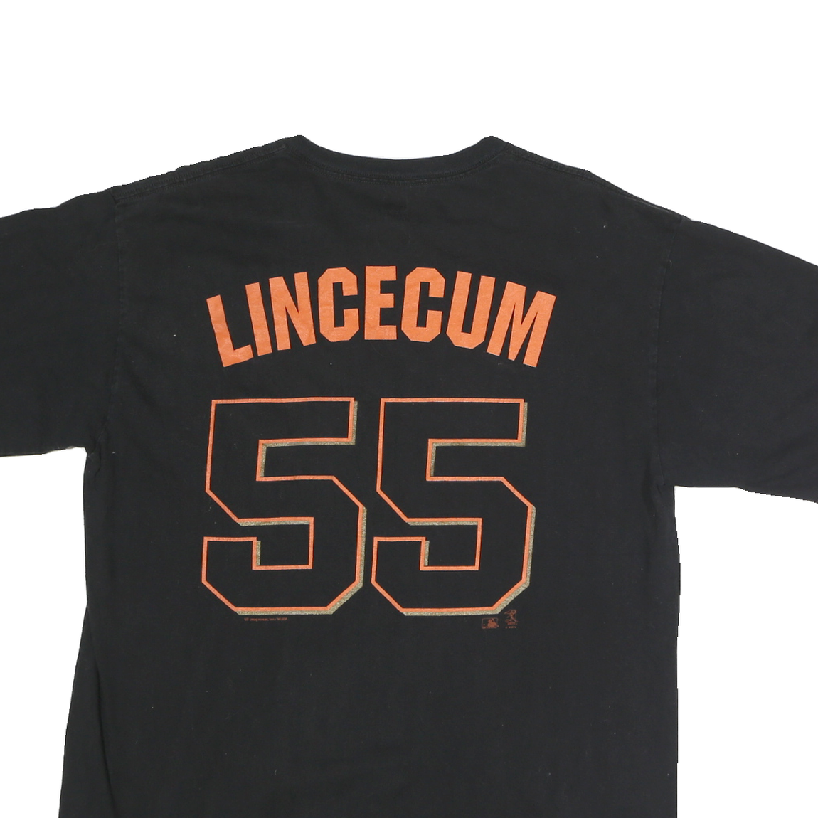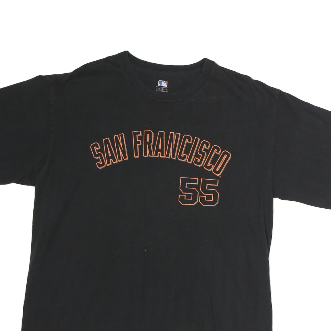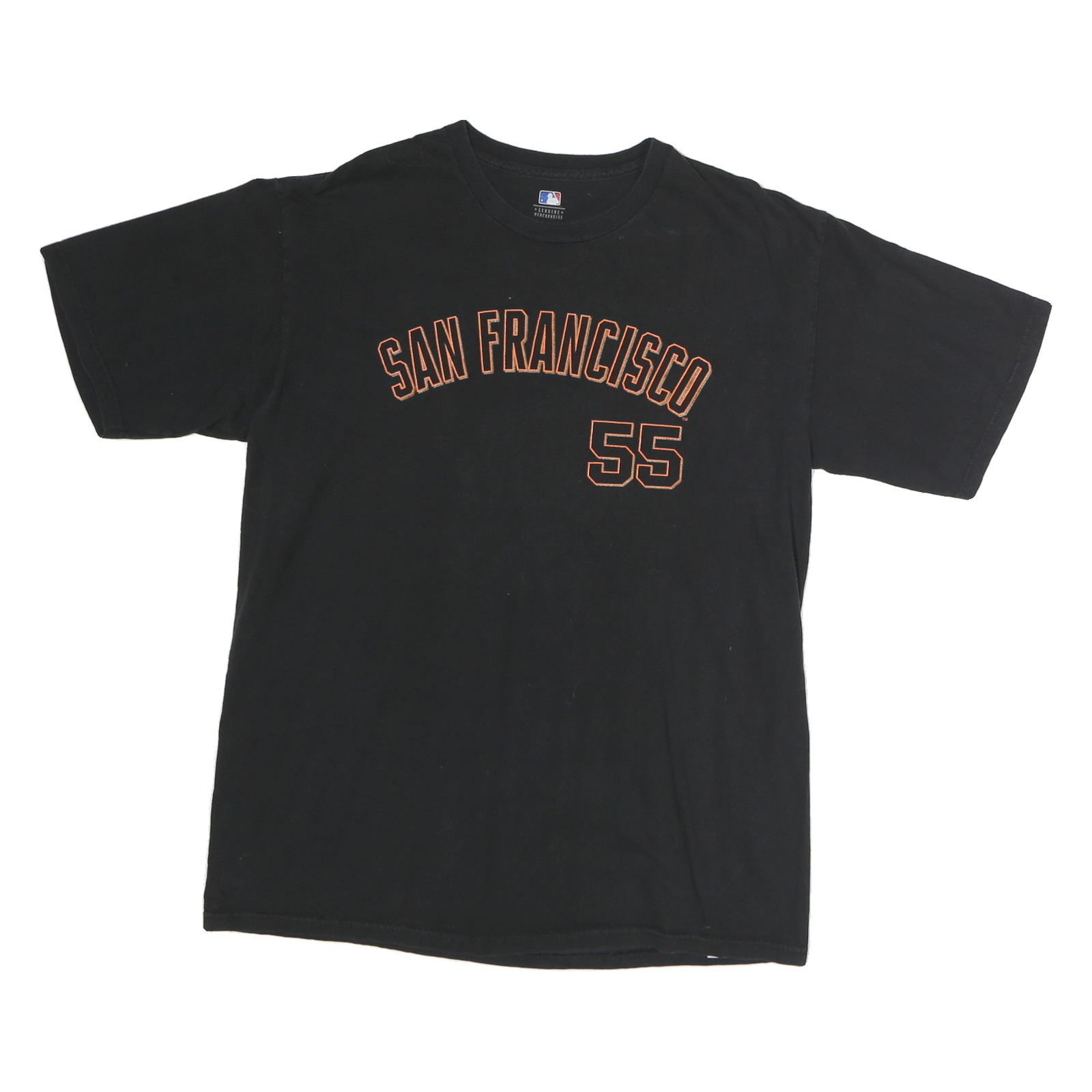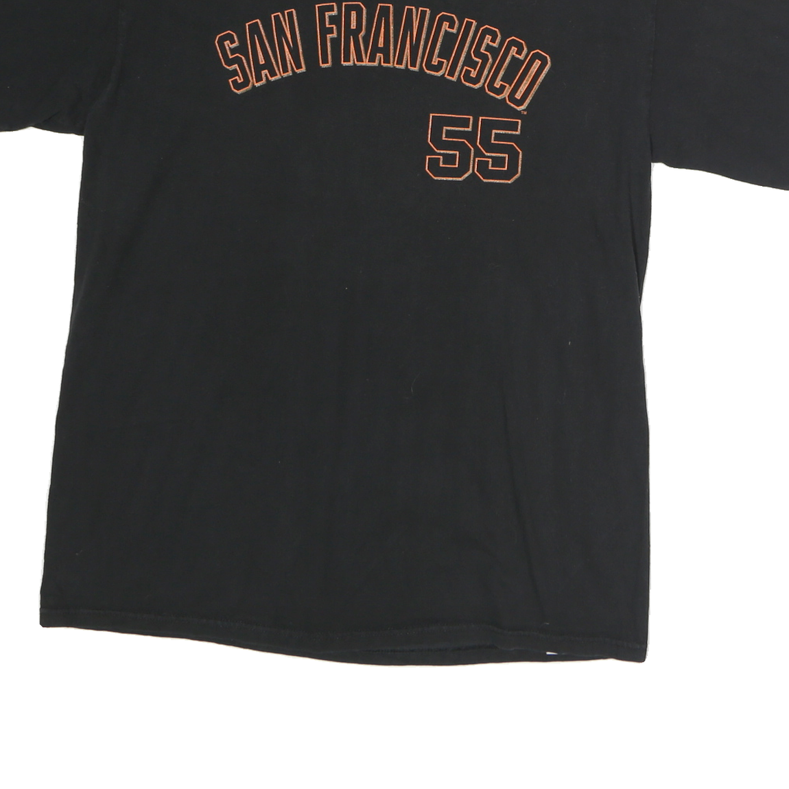 This Genuine Merchandise mens T-shirt features a black base with orange text and numbers. The front displays "SAN FRANCISCO" arched in capital letters above the number "55". The back features the name "Lincecum" above a large "55" in the same orange colour. The shirt is made from 100% cotton and offers a comfortable, soft feel ideal for casual wear.