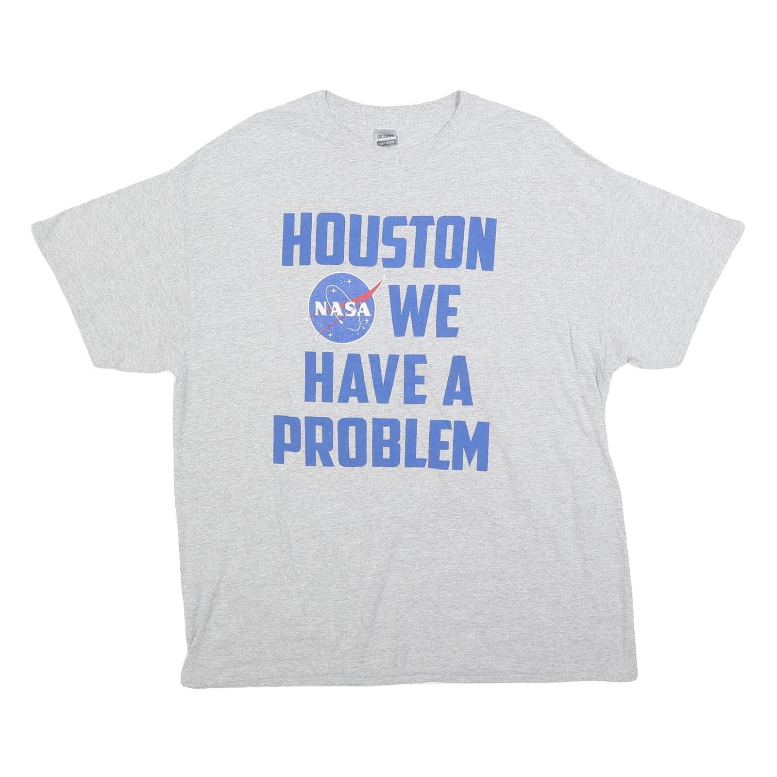 This GILDAN mens t-shirt presents a light grey cotton blend fabric adorned with bold blue text reading 'HOUSTON WE HAVE A PROBLEM' alongside a NASA insignia graphic at the centre front. The print stands out clearly against the grey background for a statement space-themed look.