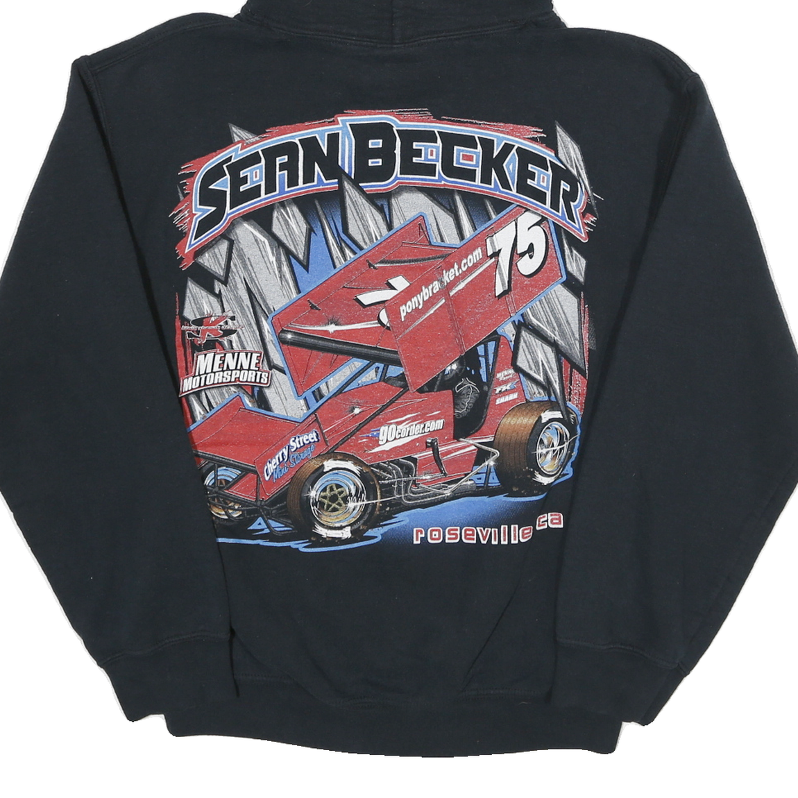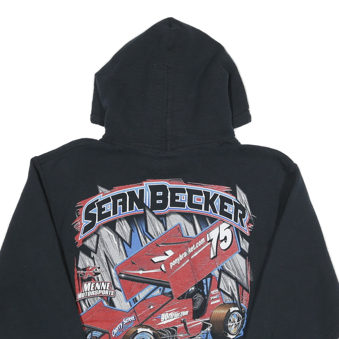 This womens GILDAN pullover hoodie presents a bold black colour with striking graphic prints on both front and back. The front showcases the text "Sean Becker 75" alongside stylised stripes in blue and red, while the back features a detailed, vivid image of a red sprint racing car, bearing the same number 75 and various sponsor names. The designs include vibrant red, blue, white, and grey tones, making a standout statement.