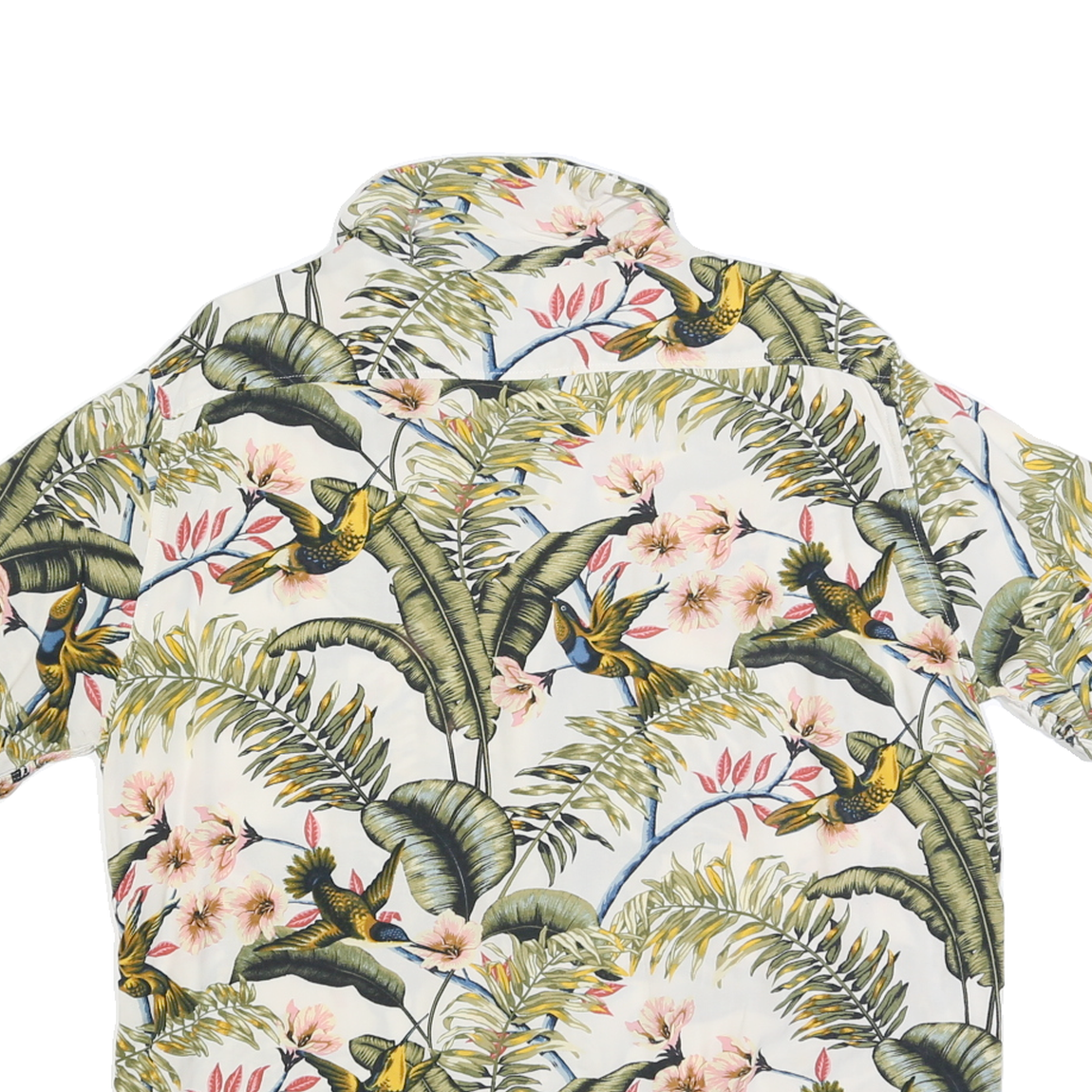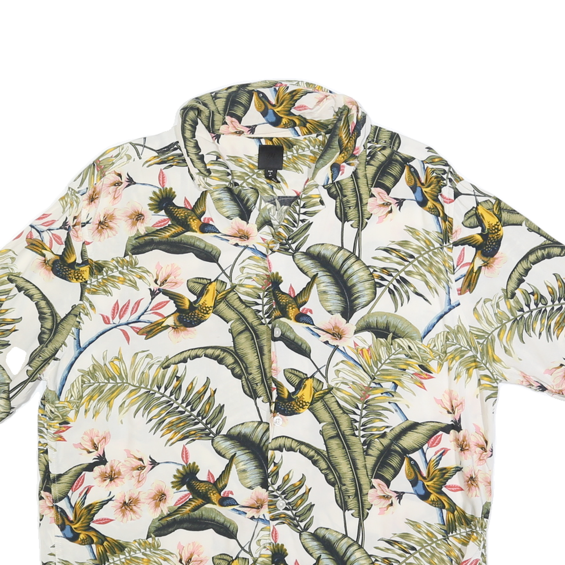 This H&M mens shirt features a vibrant tropical bird and foliage print on a white background, creating a lively and eye-catching design. The shirt has short sleeves and a classic collar, ideal for warm weather and casual outings.