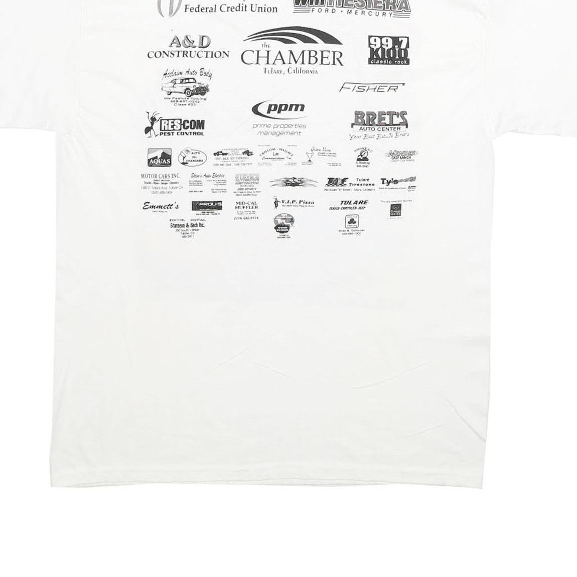 This Hanes Mens T-shirt features a bold front graphic depicting three classic cars in vibrant red and green against a white background, with the text '2005 Cars In The Park Tulare, CA'. The back continues the theme with multiple sponsor logos in black print. Crafted from 100% cotton, this shirt offers a soft, breathable feel perfect for casual wear.
