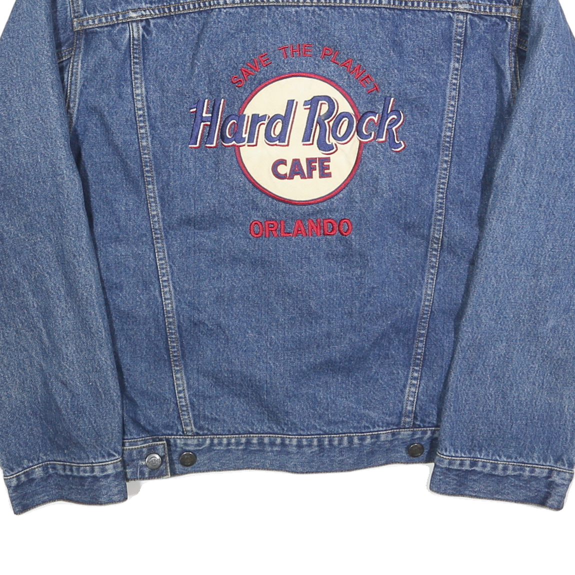 This men's jacket from Hard Rock Cafe features a classic denim design in a solid blue colourway. The front has a button closure and two chest pockets with flap detailing. The back showcases a large embroidered Hard Rock Cafe logo with the text "Save The Planet" and "Orlando" in vibrant colours, adding a unique branded touch typical to Hard Rock merchandise.