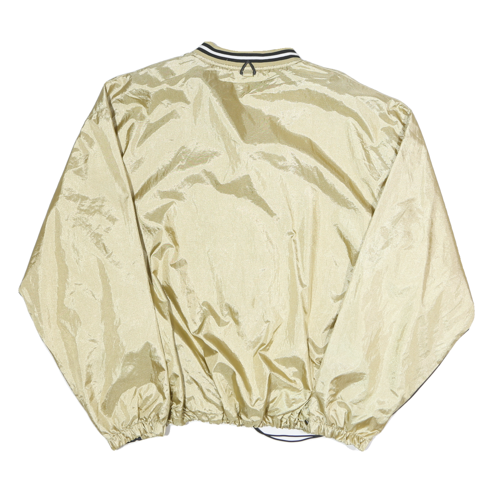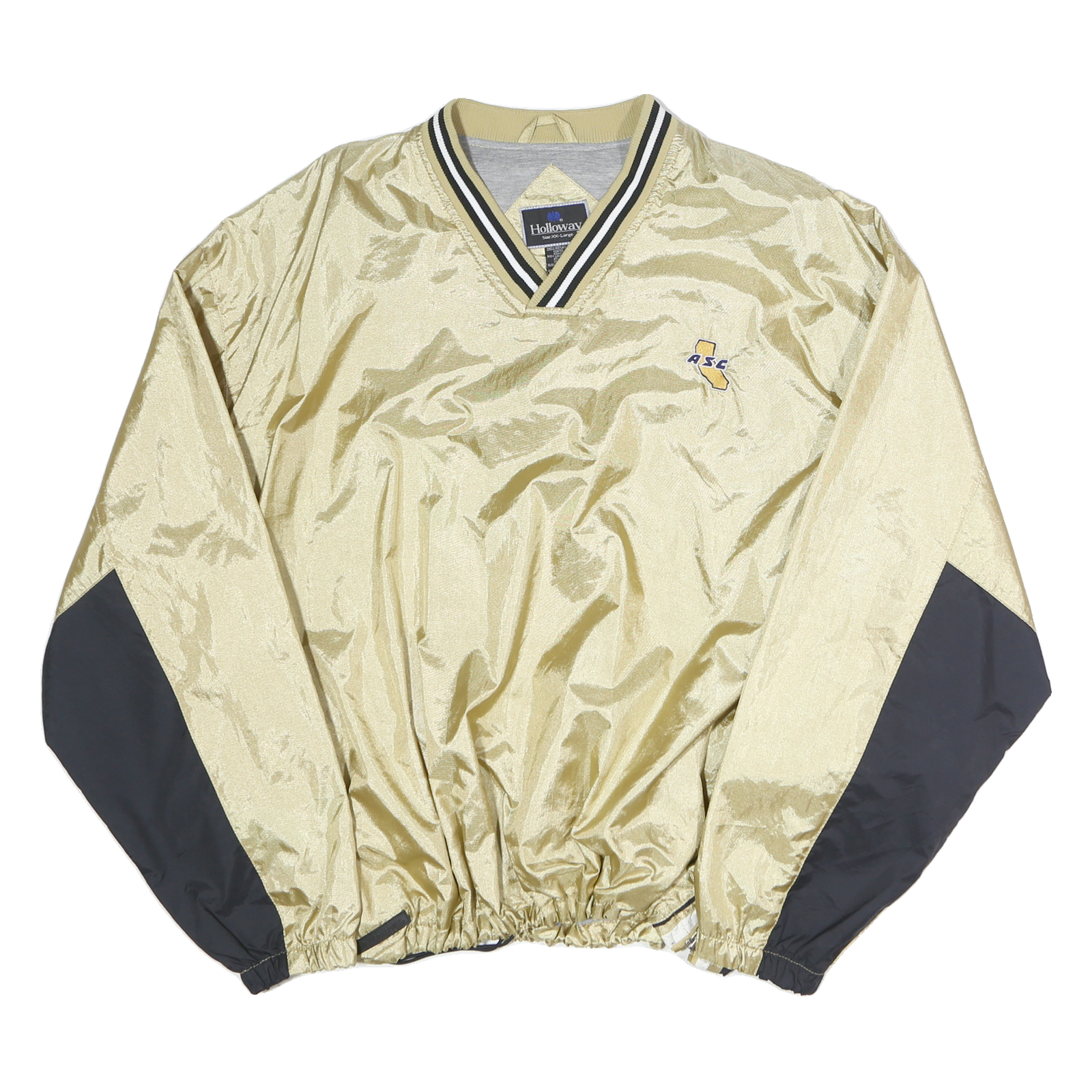 This men's sweatshirt from HOLLOWAY features a shiny gold polyester fabric with contrasting black panels on the lower sleeves for a sporty look. The front showcases a small embroidered design in the shape of California with the letters ASC, adding subtle branded detail. It has a V-neckline with gold, white, and black striped ribbed collar, offering a classic athletic style.