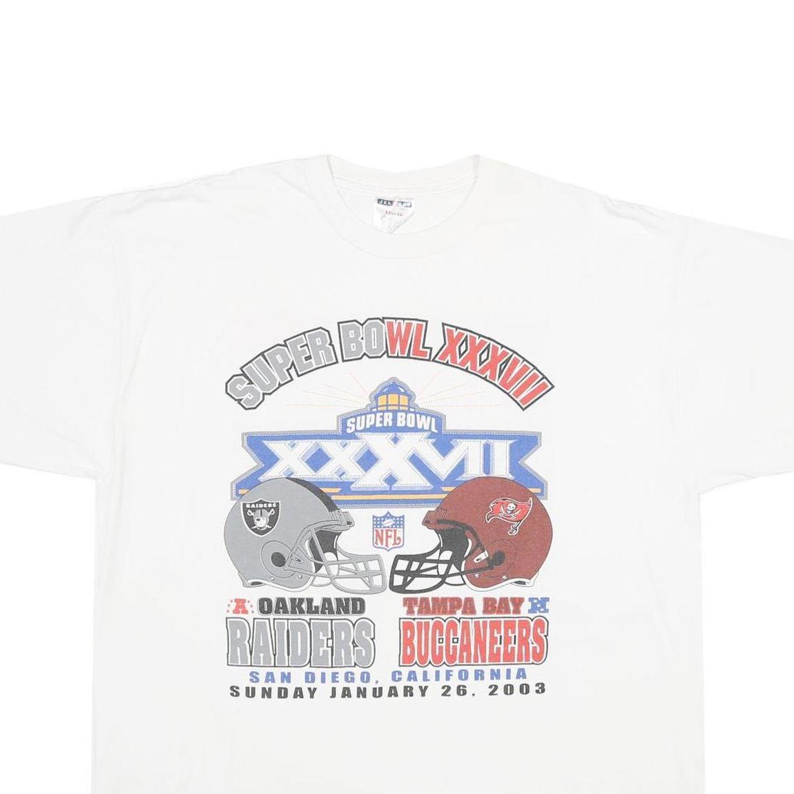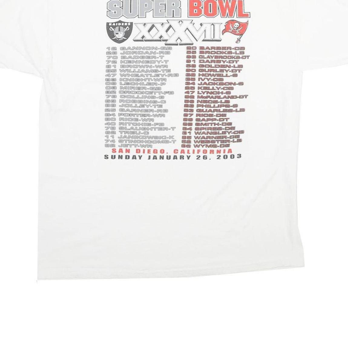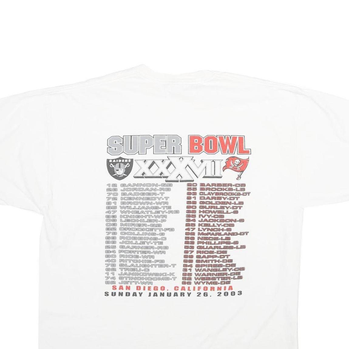 This vintage Jerzees T-shirt features a white cotton fabric with a bold graphic print celebrating Super Bowl XXXVII, held on January 26, 2003. The front showcases the helmets of the Oakland Raiders and Tampa Bay Buccaneers, along with event details and team names, while the back lists player names from both teams. The print is predominantly in grey, red, and blue tones, standing out on the classic white background.