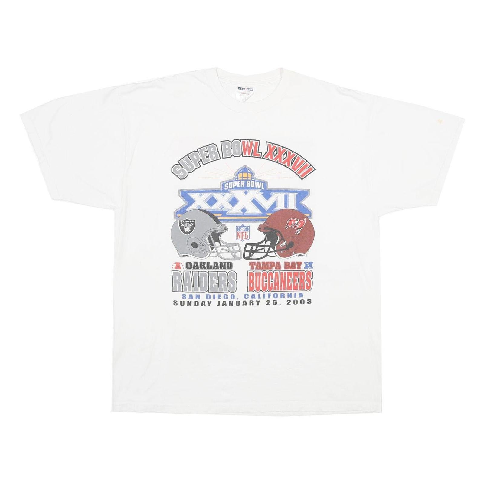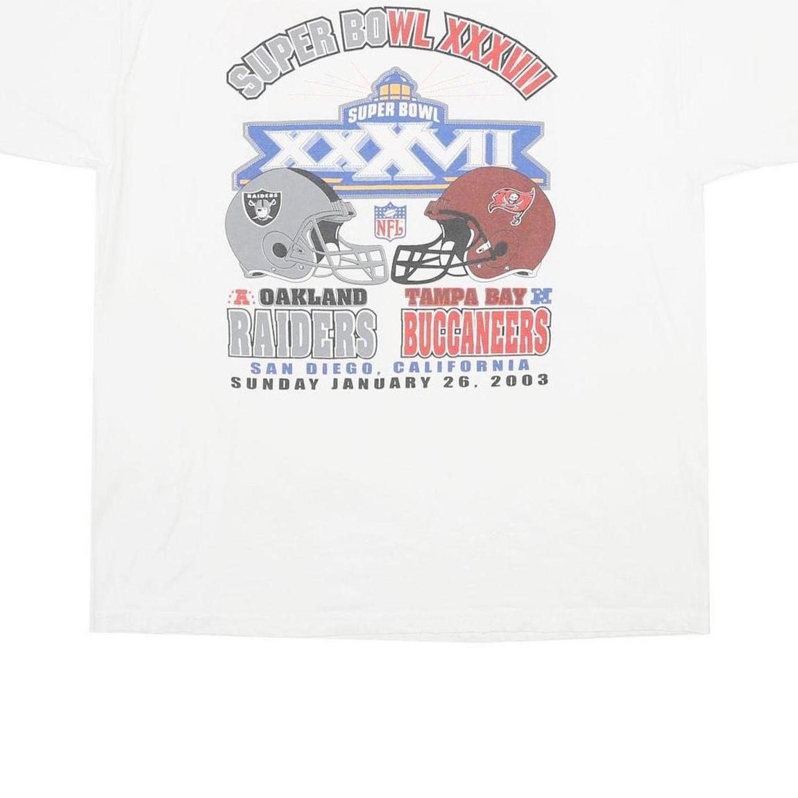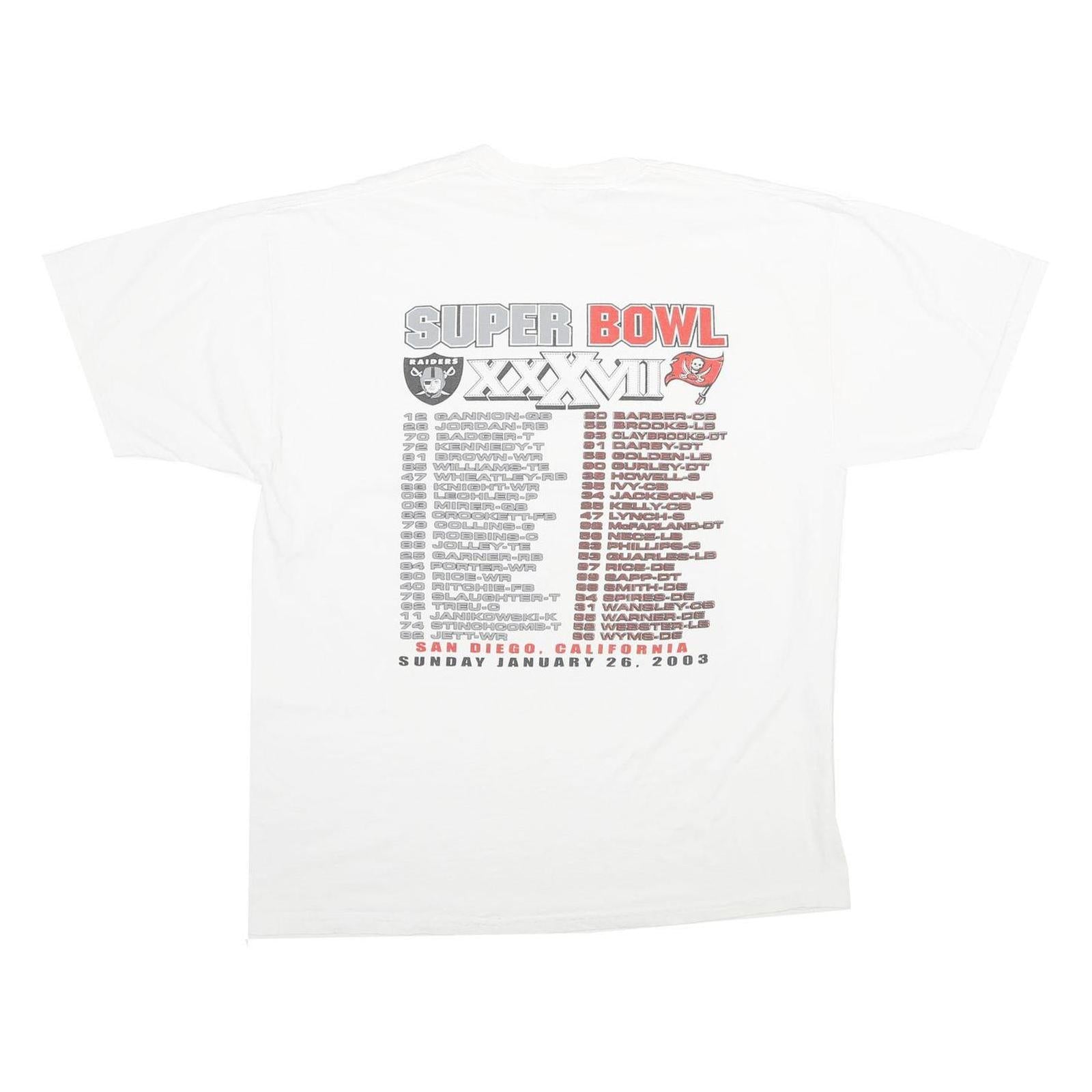 This vintage Jerzees T-shirt features a white cotton fabric with a bold graphic print celebrating Super Bowl XXXVII, held on January 26, 2003. The front showcases the helmets of the Oakland Raiders and Tampa Bay Buccaneers, along with event details and team names, while the back lists player names from both teams. The print is predominantly in grey, red, and blue tones, standing out on the classic white background.