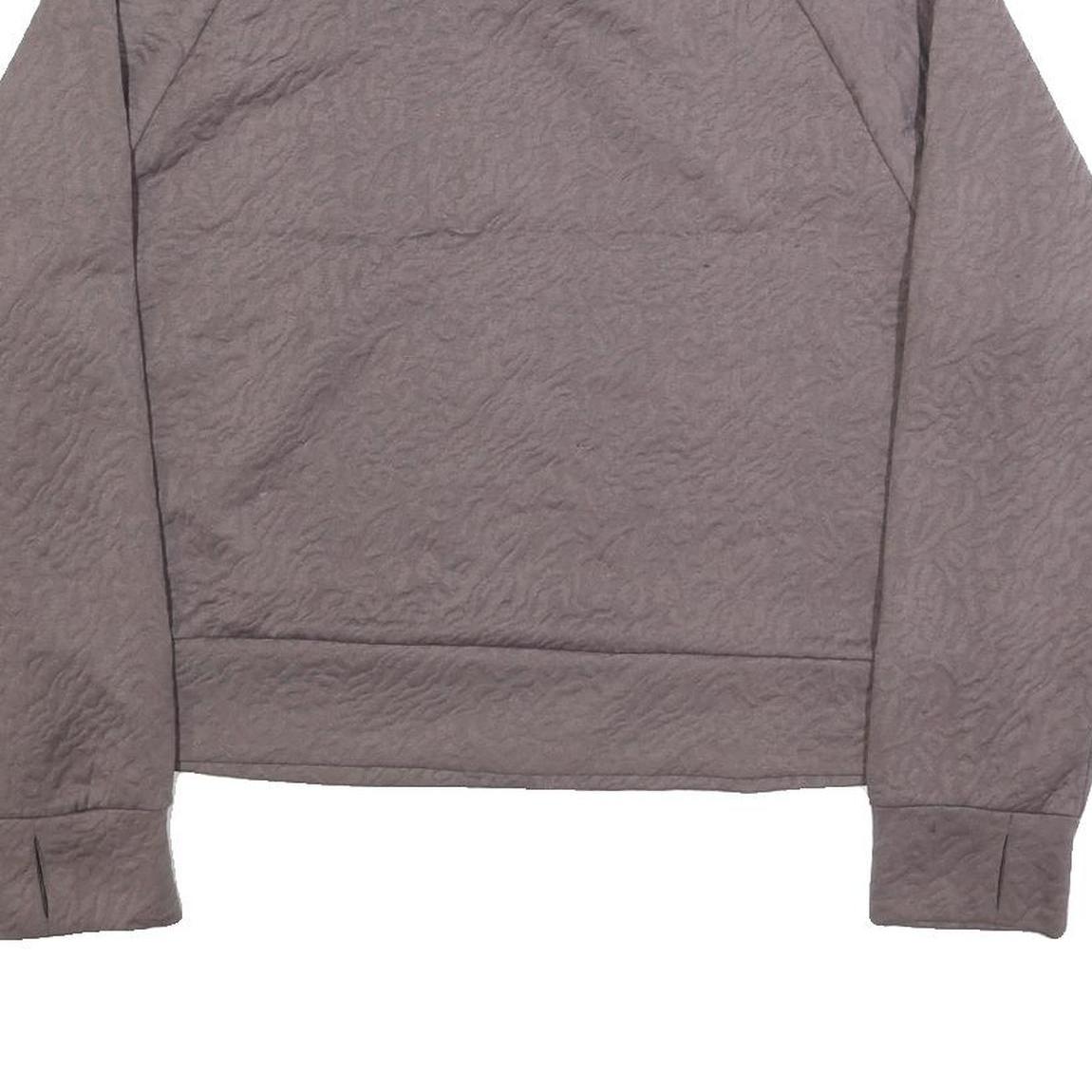 This Juicy Couture womens sweatshirt features a unique brown colour with a subtle textured pattern throughout the fabric. It has a high neck with adjustable drawstrings for a stylish and comfortable fit. The design is plain without any visible logos or prints, offering a versatile look. The sweatshirt is cropped to a modern length, providing a trendy silhouette.