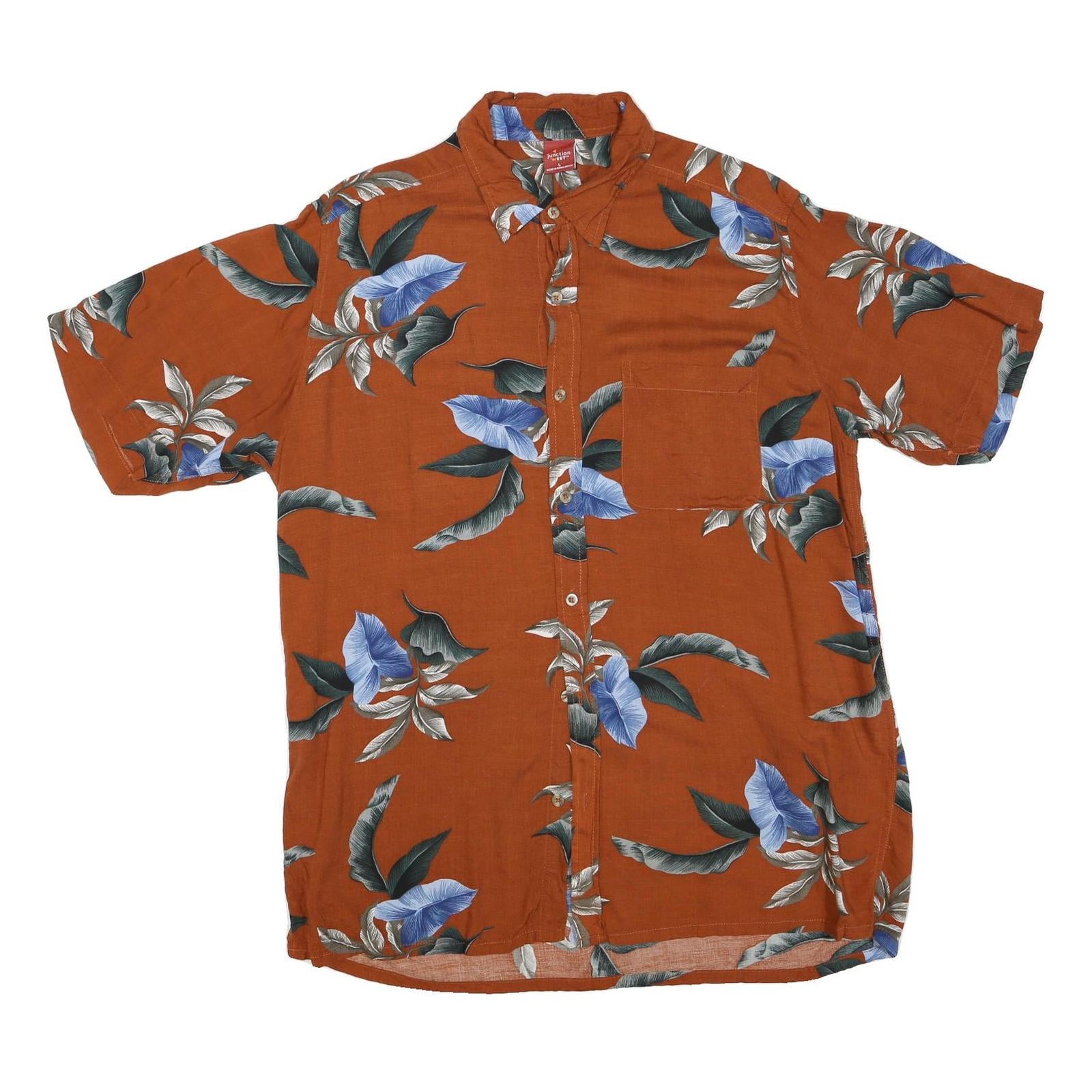 This men's shirt from JUNCTION WEST features a vibrant burnt orange base adorned with a bold floral print in shades of blue, green, and white. The graphic detailing gives it a tropical vibe perfect for warm weather or casual outings.