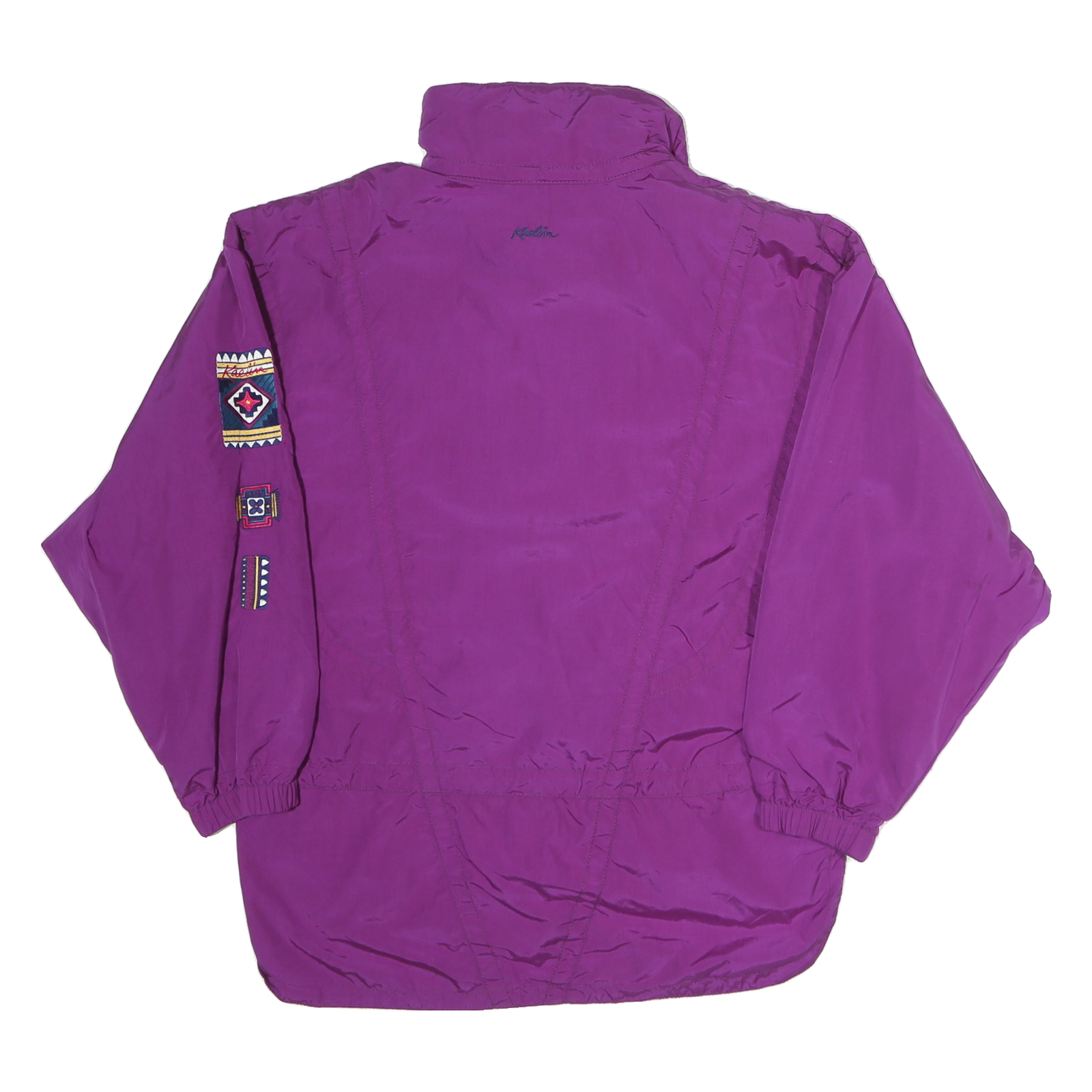 This womens jacket by Kaelin is crafted from smooth purple nylon that offers a lightweight, wind-resistant feel. It features a high stand-up collar and front zip closure with an additional flap fastened by decorative snap buttons showcasing a Native-inspired embroidered eagle motif. The long sleeves have elastic cuffs and detailed embroidered geometric patches running down the left arm for added visual interest.