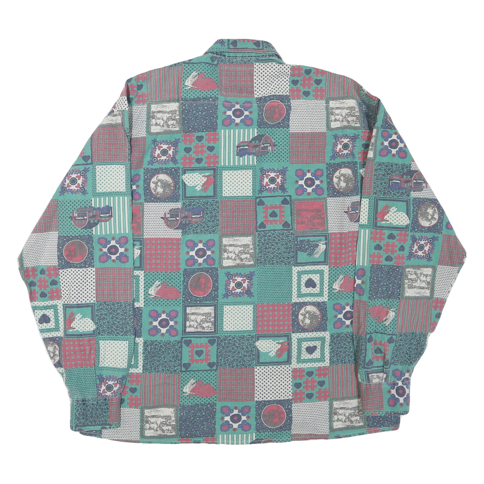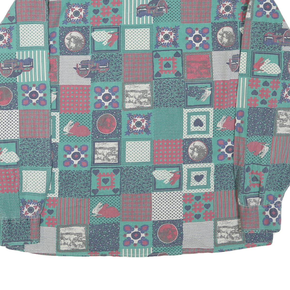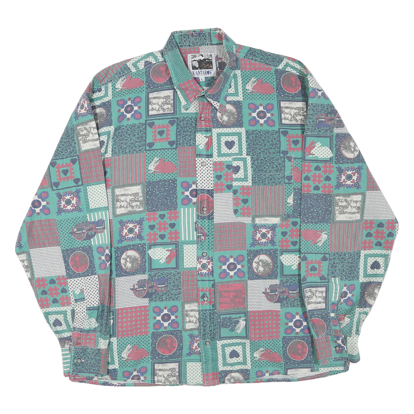 This KANTAROS mens shirt features a vibrant patchwork-inspired check pattern in green and red tones, accented with various motifs including hearts, rabbits, and floral elements. The button-down shirt has a classic collar and a single chest pocket that blends seamlessly with the bold pattern.