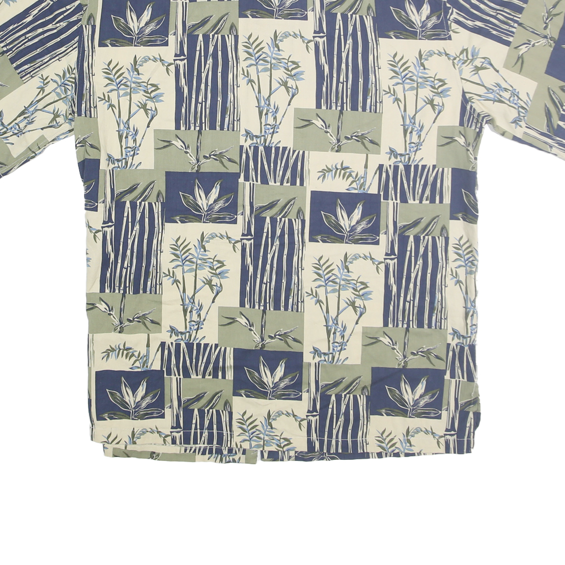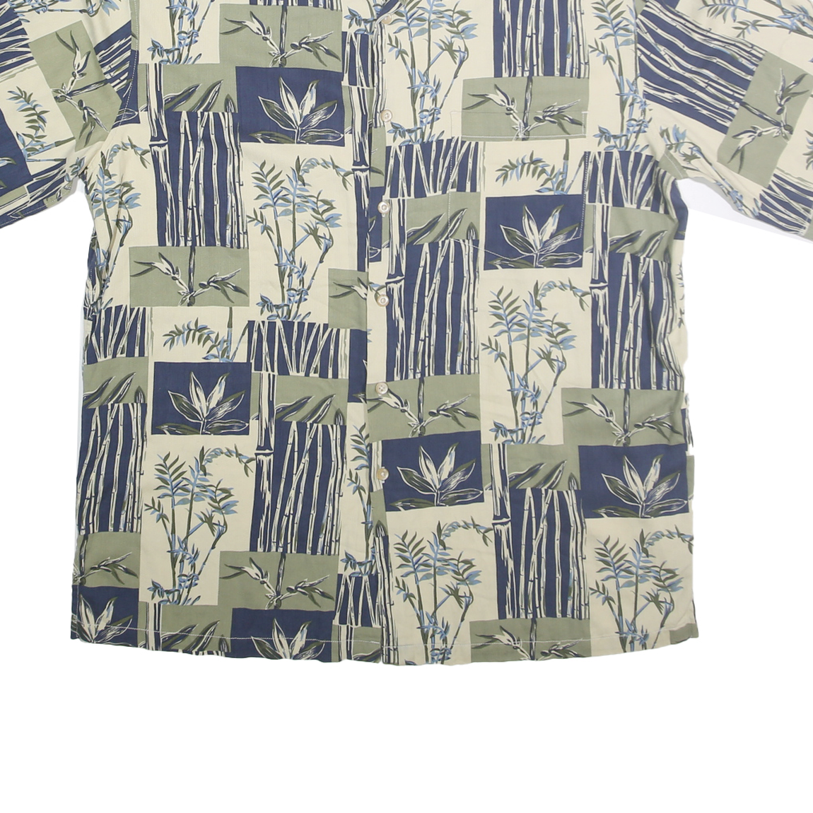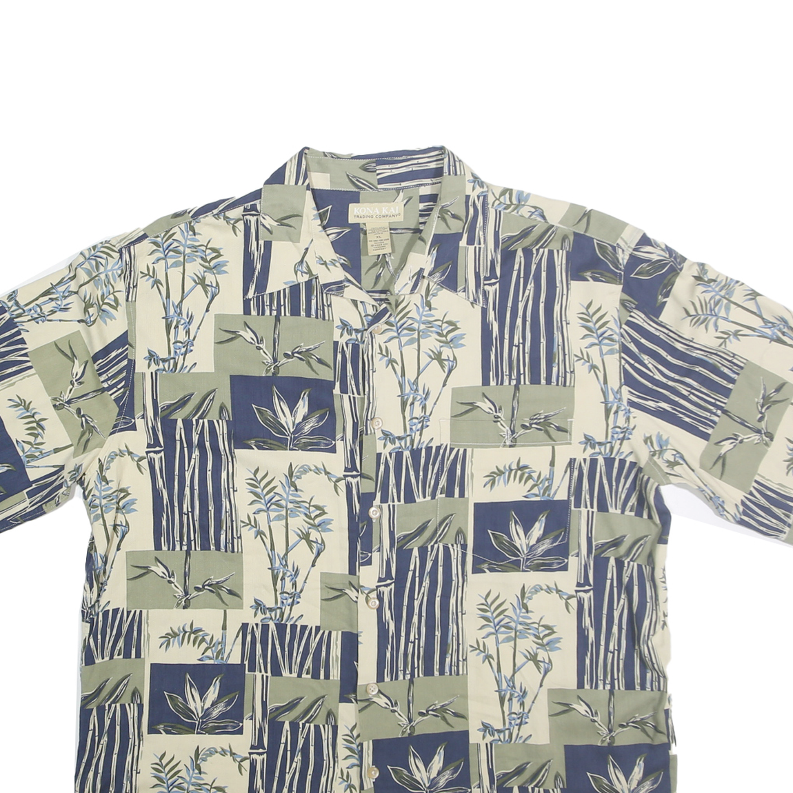 This KONA KAI mens shirt features a distinctive Hawaiian style print with blocks of cream, blue, and green. The design showcases tropical foliage and bamboo motifs arranged in a patchwork style, giving it a relaxed and casual vibe. It has a classic short sleeve cut with a button front and a spread collar.
