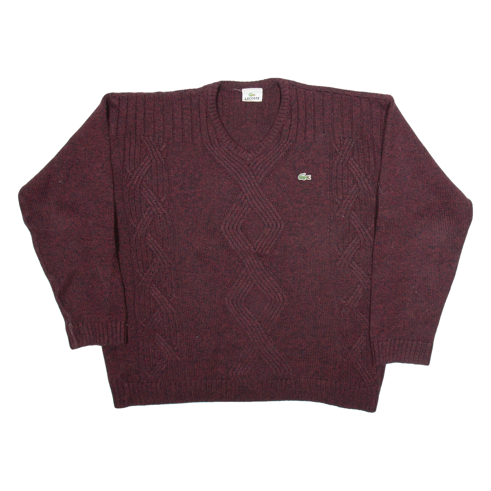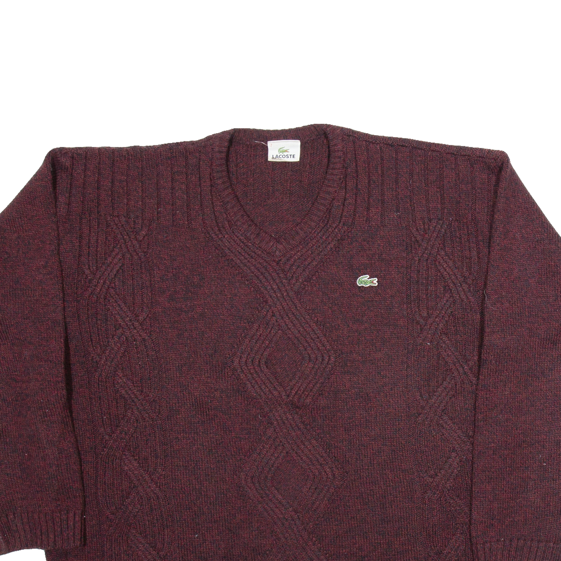 LACOSTE Womens Patterned Jumper Maroon Geometric V-Neck Tight Knit Wool XL
