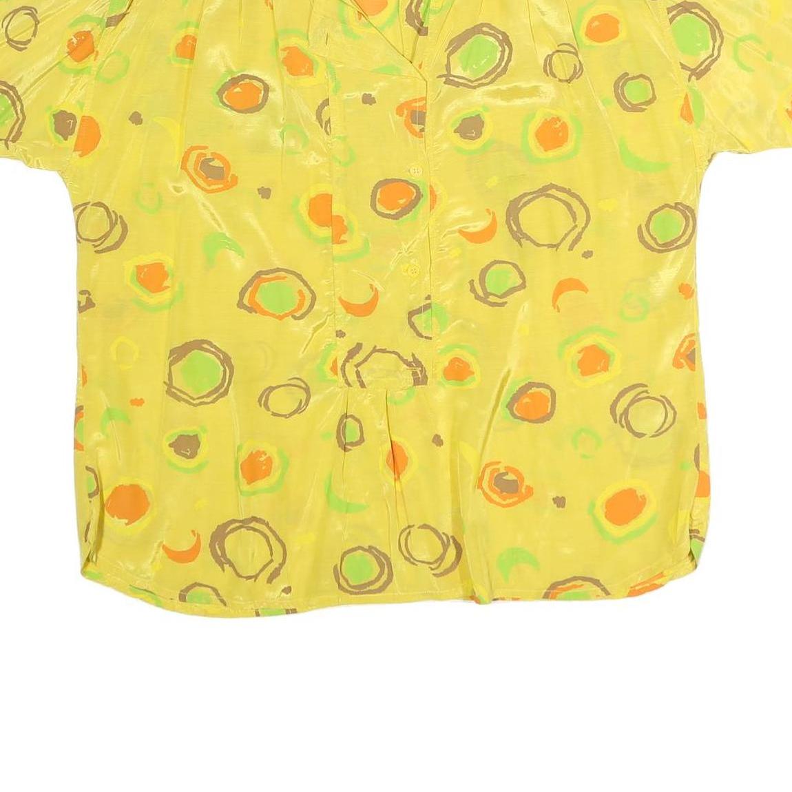 This womens shirt by LEMON features a vibrant yellow base adorned with playful, multicoloured circular prints including green, orange, and brown tones. The pattern is scattered evenly across the fabric, giving it a lively, contemporary look suitable for casual or summer wear.