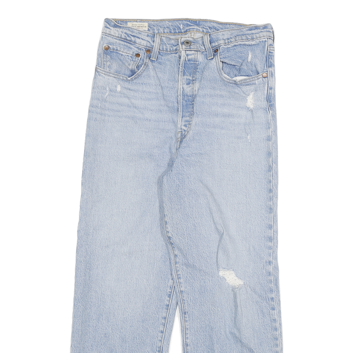These Levi's Big E womens jeans feature a light blue cotton blend denim with a plain pattern and authentic button closure. Designed with the iconic red tab and rivet reinforcements, they showcase a classic five-pocket style ideal for vintage denim lovers.
