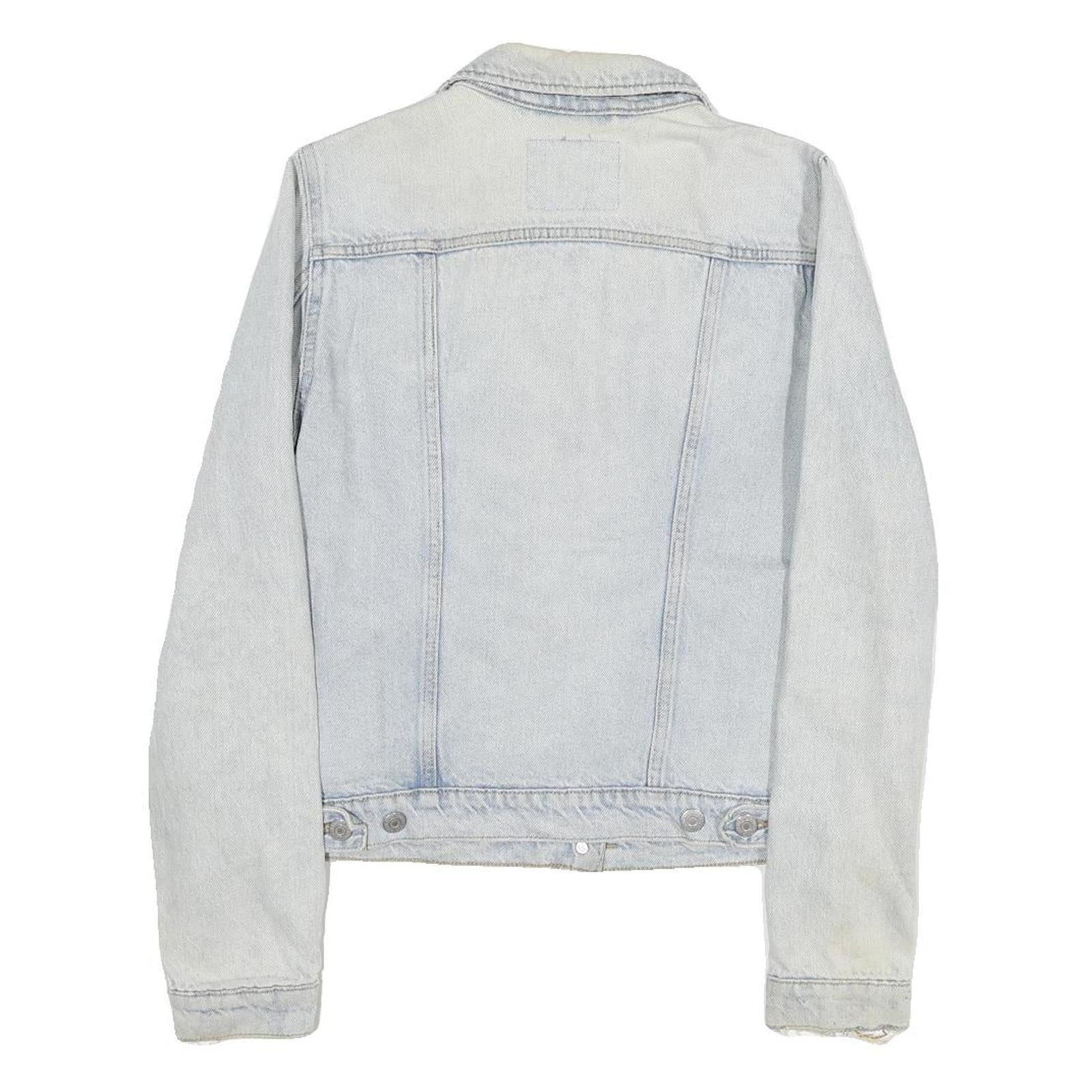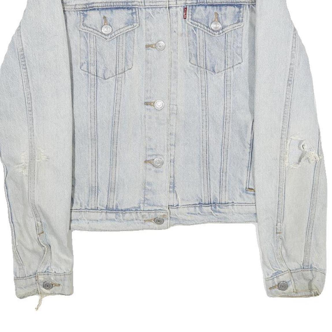 There are visible distressed details on the sleeves and minor wear marks consistent with pre-loved condition, adding character to the jacket. The collar is a classic pointed style, and the buttoned cuffs achieve a traditional denim jacket look. Levi's is renowned for its durable denim products and vintage-inspired designs, making this jacket a stylish and versatile outerwear option.