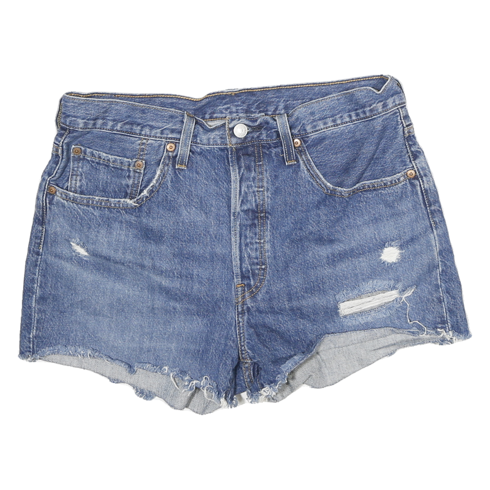 These womens Levi's denim shorts feature a classic medium blue wash with a distressed finish, including purposeful fraying and small worn patches for an authentic vintage look. The shorts have a traditional five-pocket design with copper rivets and contrast stitching, ending in a raw cut-off hem for casual, effortless style.