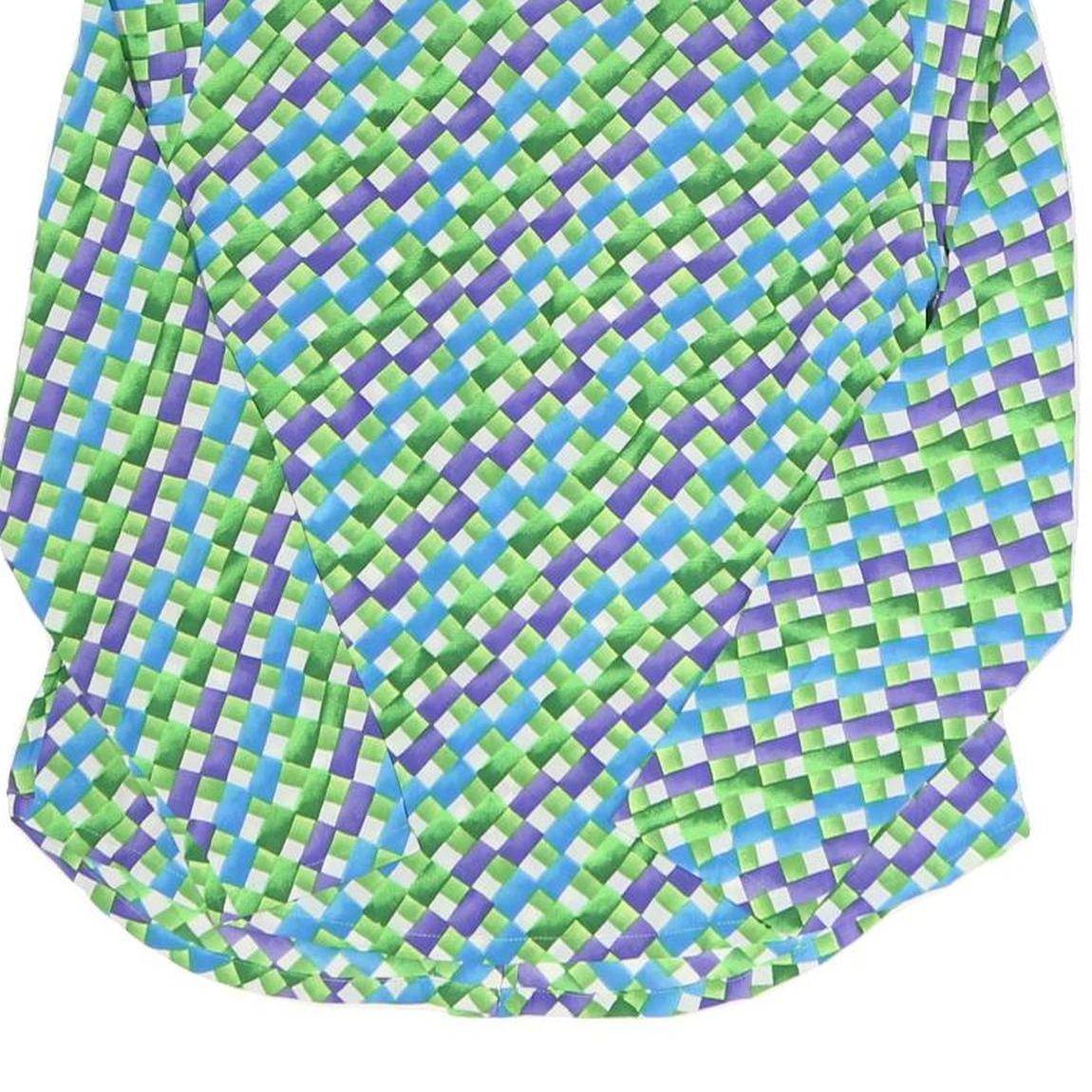 This Liang Yeoi womens shirt features a vibrant printed pattern in green, blue, and subtle purple hues forming a woven checker effect. It has a classic collared neckline and long sleeves with button fastenings down the front, adding a timeless tailored look.