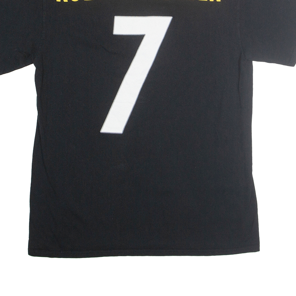 This Majestic men's T-shirt is crafted from a soft cotton blend, featuring a classic black colour that is both versatile and stylish. The front showcases a large white number 7 beneath a small Pittsburgh Steelers logo, while the back displays the name ROETHLISBERGER in bold yellow lettering above a matching white number 7. This graphic tee offers a sporty look perfect for fans of the iconic NFL team.