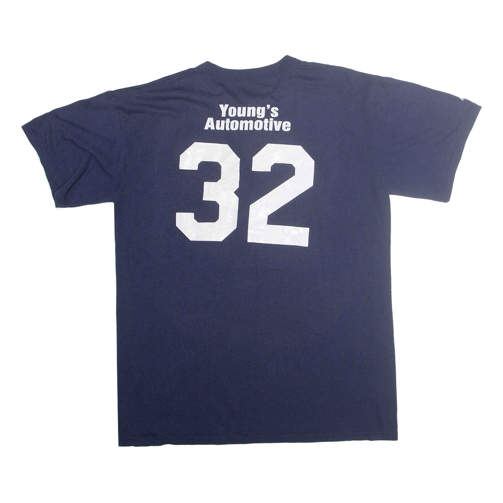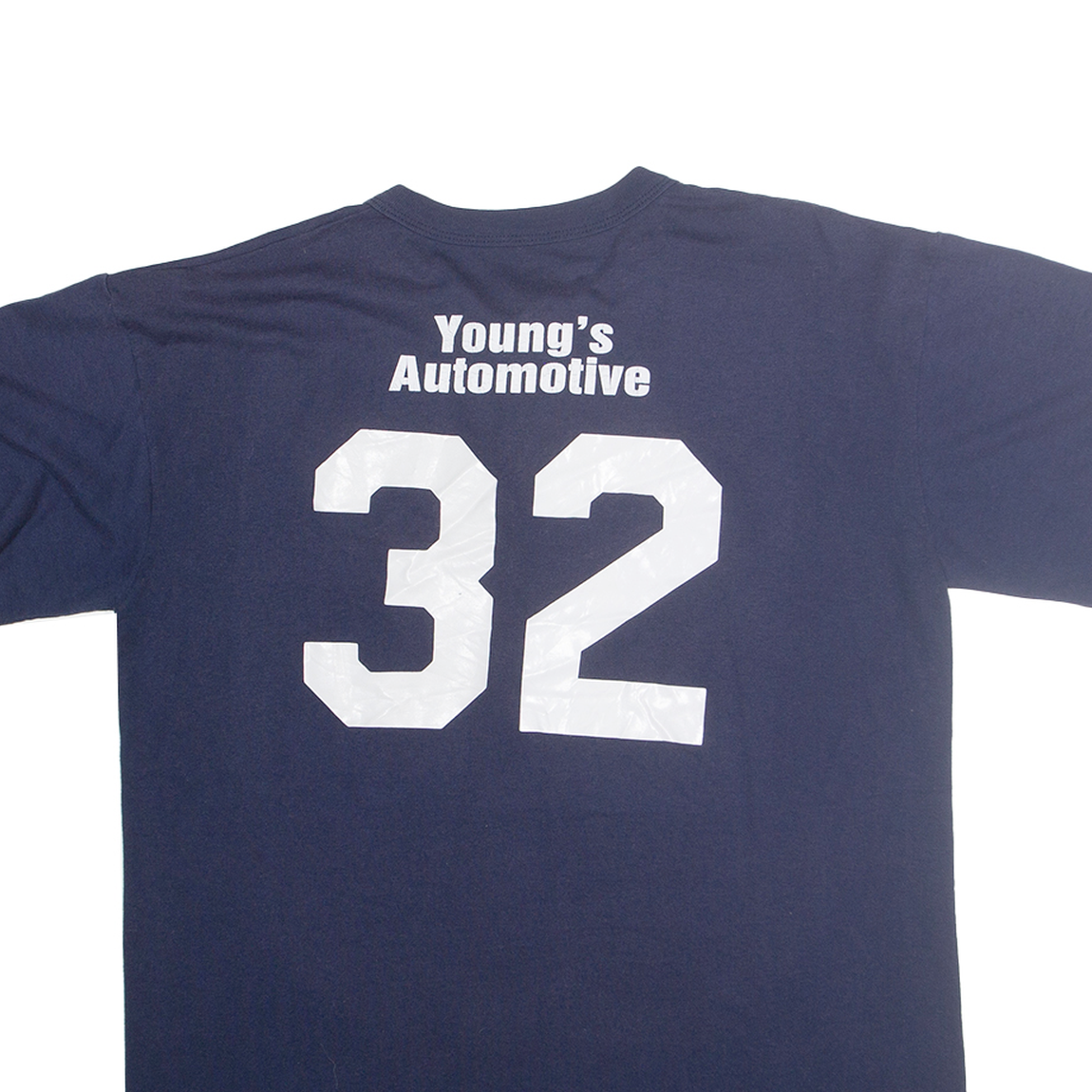This Majestic mens T-shirt features a deep navy blue colour with a prominent graphic on the front showcasing the word 'Braves' alongside a distinctive tomahawk design in red and yellow. The reverse side displays a large white number 32 with the text 'Young's Automotive' above it, adding a sporty and team-inspired style.