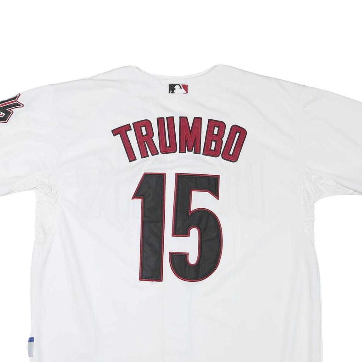 This Majestic baseball shirt features a clean white base with 'Dbacks' boldly printed across the front in maroon outlined black text. The back displays the name 'Trumbo' and the number 15 in matching colours. The sleeves are short with maroon and black trim on the edges, adding a striking contrast.