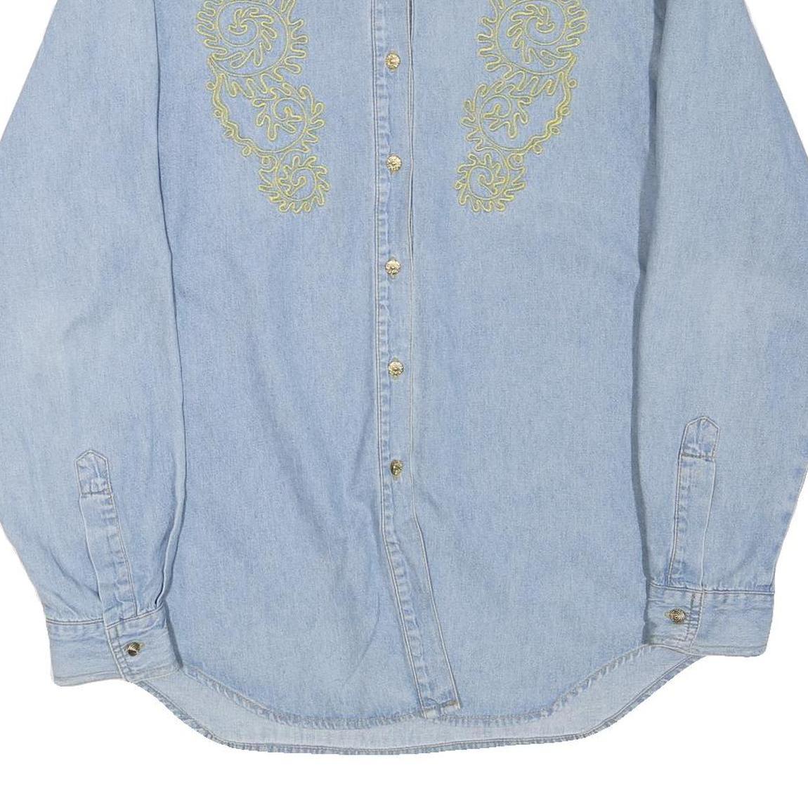 Mens Blue Light Denim Embroidered Cotton Blend Shirt M Casual Long Sleeve