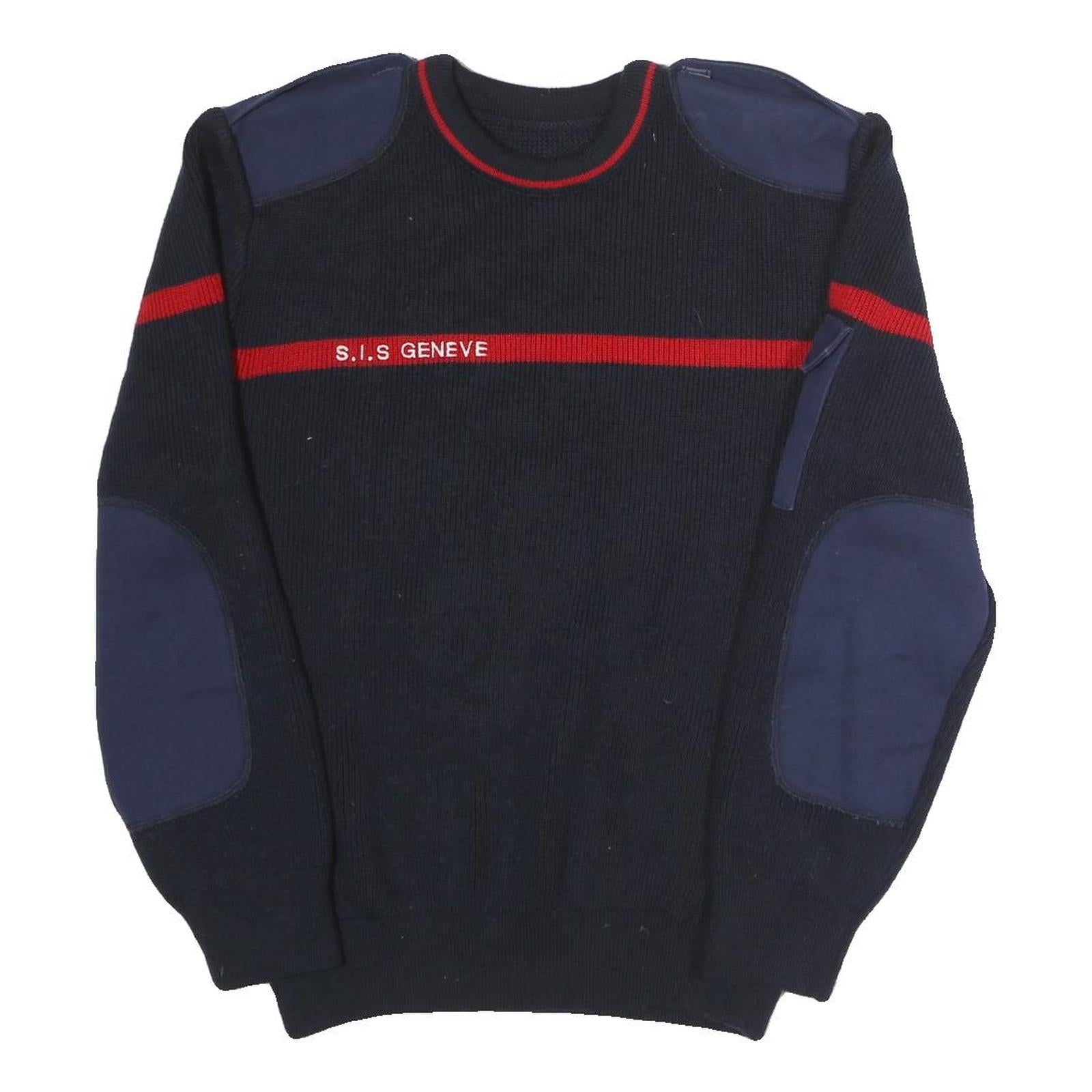 This men's jumper features a navy blue base with a bold red horizontal stripe across the chest and sleeves, embroidered with the text 'S.I.S GENEVE' for a subtle, distinctive detail. The jumper includes navy blue shoulder and elbow patches which add a practical and stylish military-inspired touch.