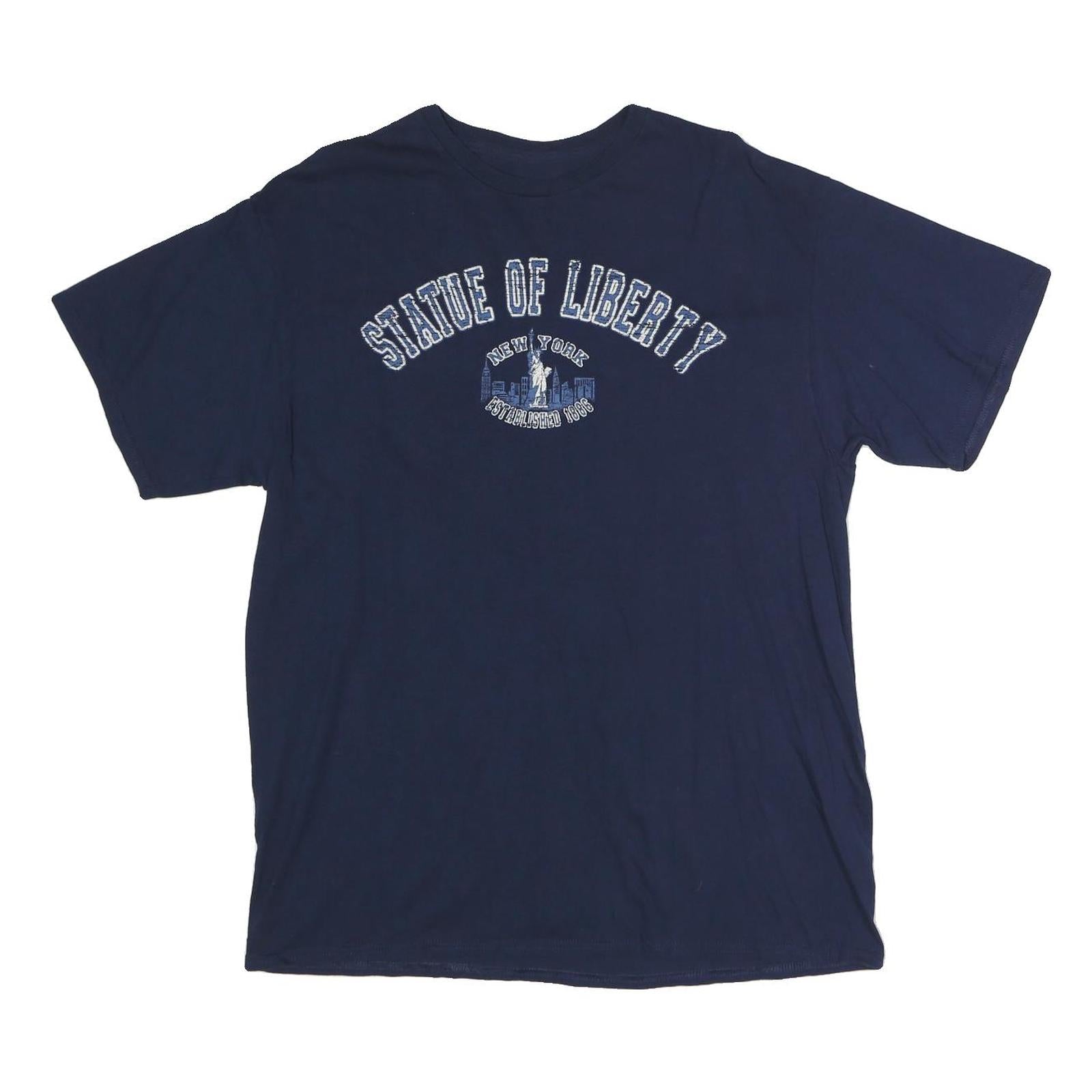 This mens T-shirt is a deep navy blue shade featuring a graphic print across the chest that reads "Statue of Liberty New York Established 1886" with an image of the Statue of Liberty surrounded by city buildings. The cotton material provides a soft, comfortable feel suitable for casual wear. It has a classic crew neck and short sleeves, offering a relaxed fit and regular length.