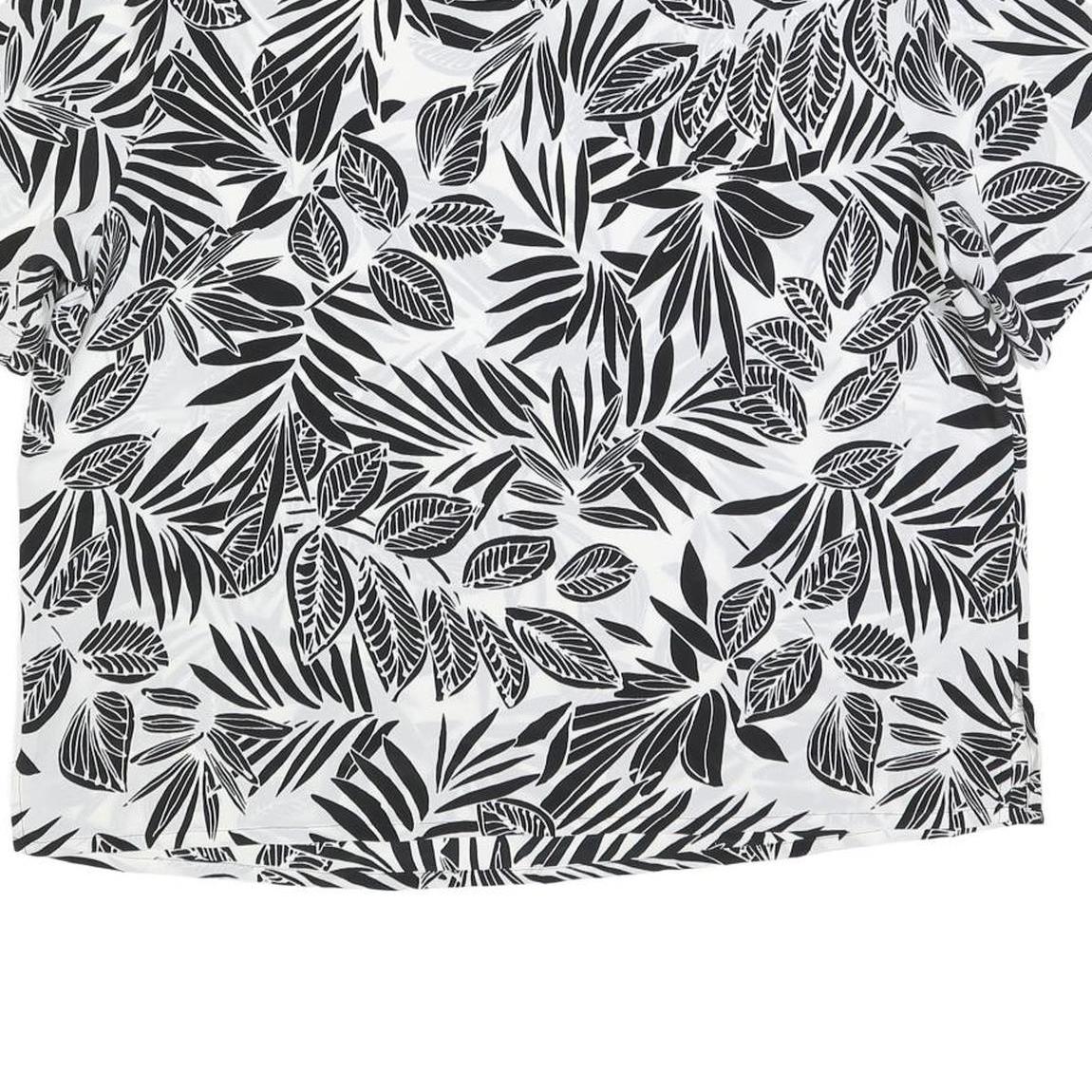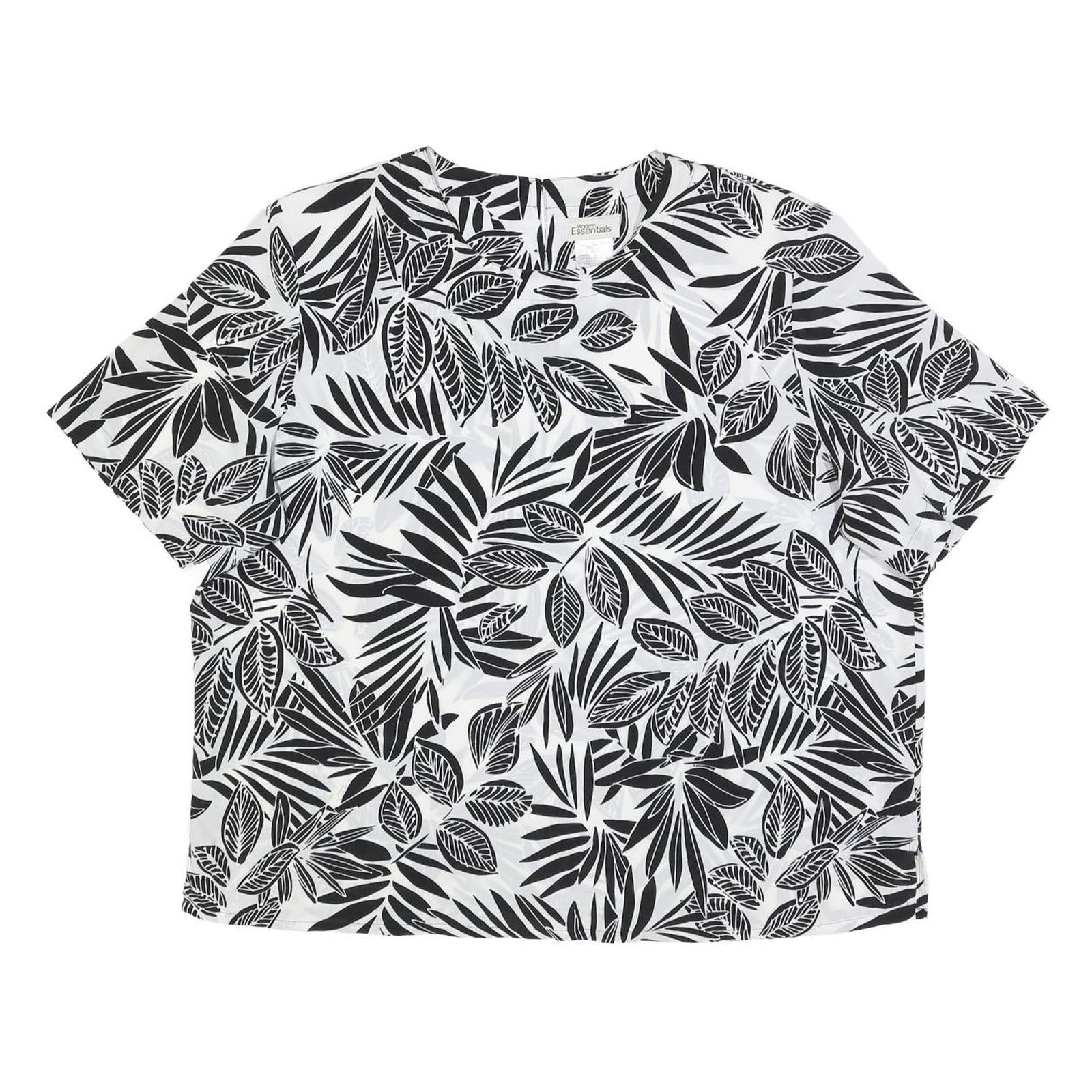 This Modern Essentials womens top features a striking black and white leaf print pattern across a smooth polyester fabric. The short sleeves and round neckline provide a classic, versatile silhouette suitable for casual or office wear.