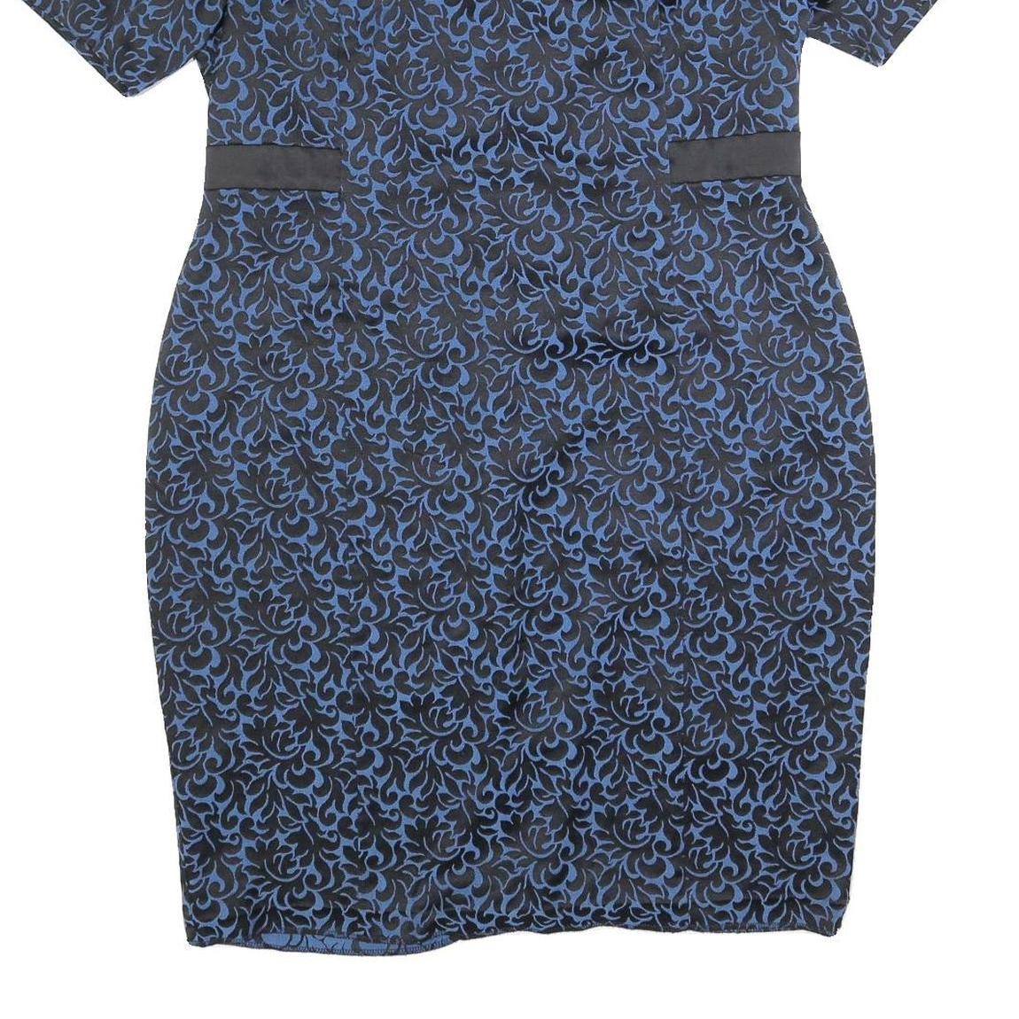 This Monsoon womens dress features an intricate blue and black jacquard pattern that adds texture and visual interest. It has a fitted silhouette with short sleeves and a scoop neckline, designed to highlight the figure elegantly. The dress fastens with a discreet zip at the back, ensuring a smooth finish.