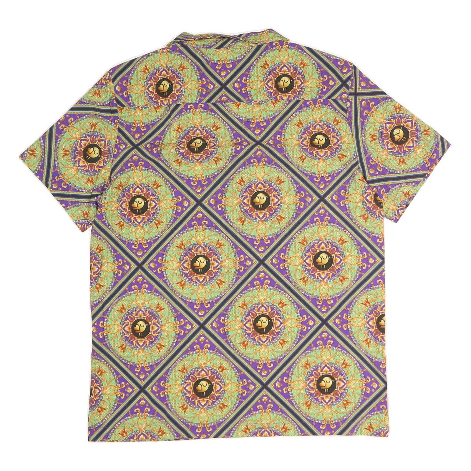 This mens shirt from Mystery Land features a vibrant purple base covered in an intricate printed pattern with circular medallion designs in gold, turquoise, and orange hues. The shirt has a classic collar and short sleeves, with matching purple buttons and a single chest pocket trimmed in purple.