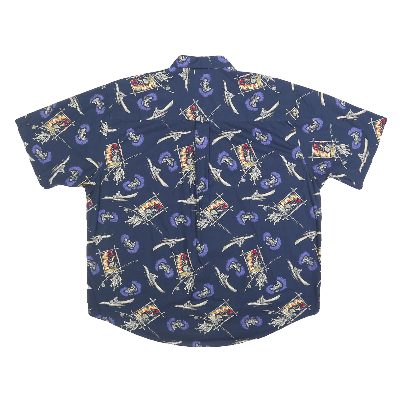 This Natural Issue mens shirt displays a navy blue base decorated with a distinctive pattern featuring sketches of traditional motifs in muted tones of cream, red, and purple. It has a classic button fastening down the front and a pointed collar, offering a timeless yet casual look. The pattern adds visual interest without overwhelming the design.