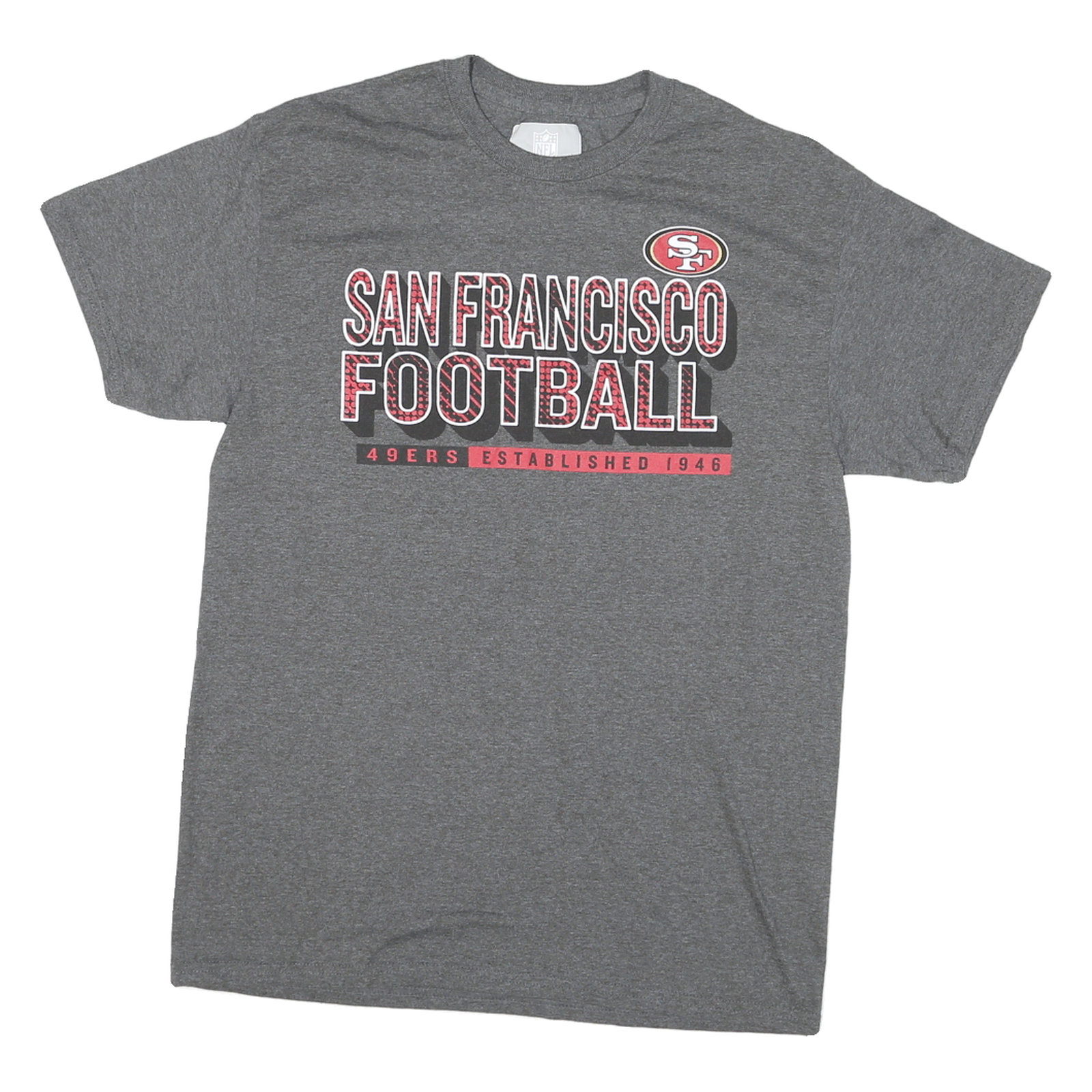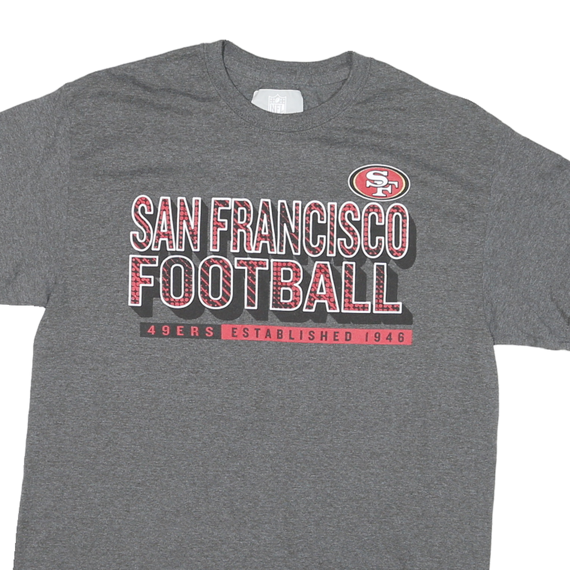 This NFL Mens T-Shirt features a classic grey colour with bold red and white printed text stating "San Francisco Football" accompanied by the San Francisco 49ers logo above. The text incorporates a subtle patterned effect within the letters for added visual interest, and beneath it states "49ers Established 1946" in red block print. The back of the shirt is plain grey.
