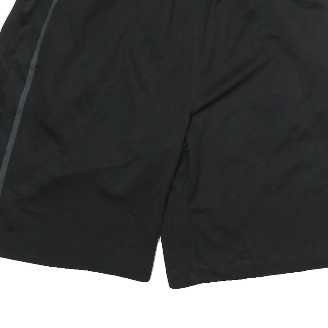 These Nike mens shorts feature a solid black colour with a subtle dark grey stripe running down the sides. A small Nike swoosh logo is embroidered near the bottom hem of one leg, providing brand recognition with a minimalist design. The fabric is a smooth polyester blend, offering a lightweight and moisture-wicking feel ideal for sports or casual wear.
